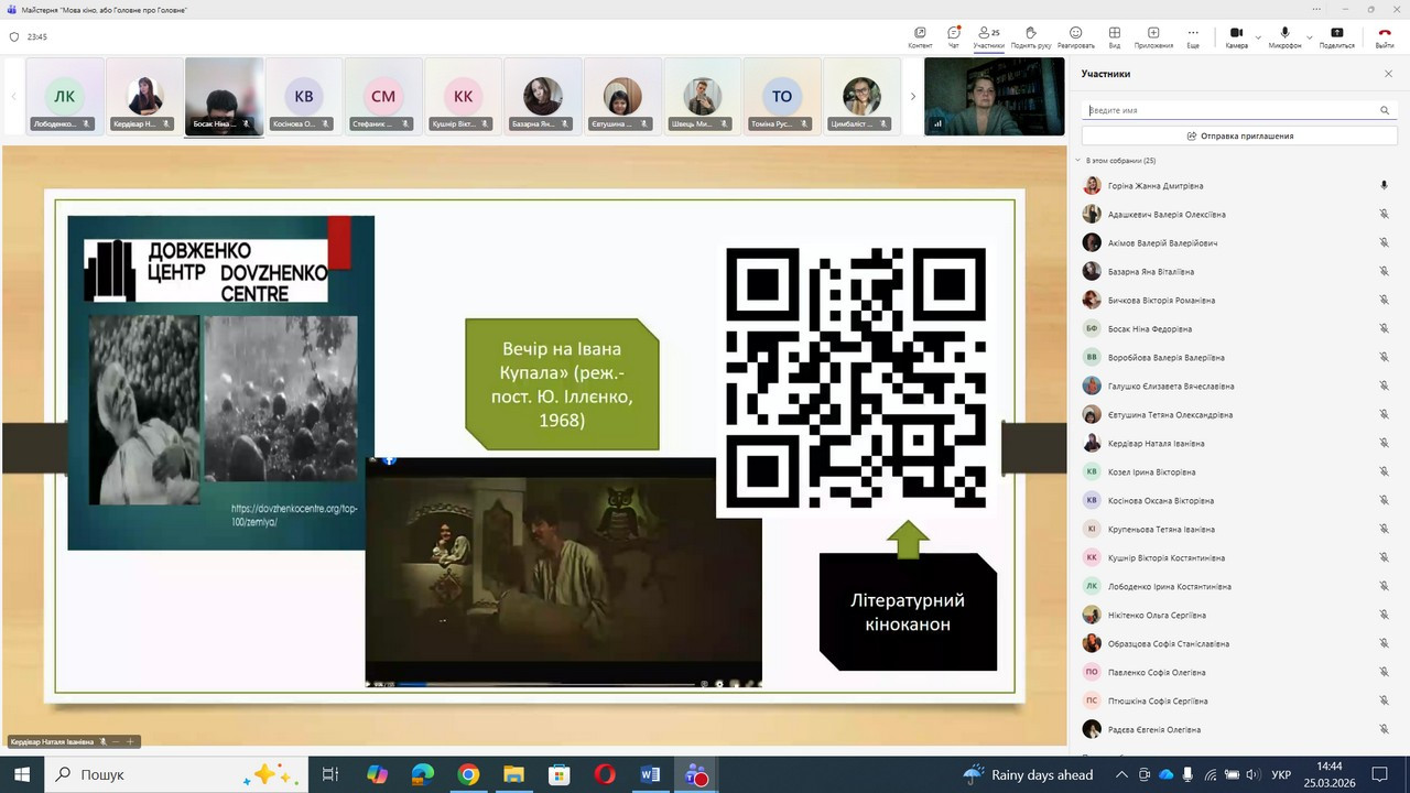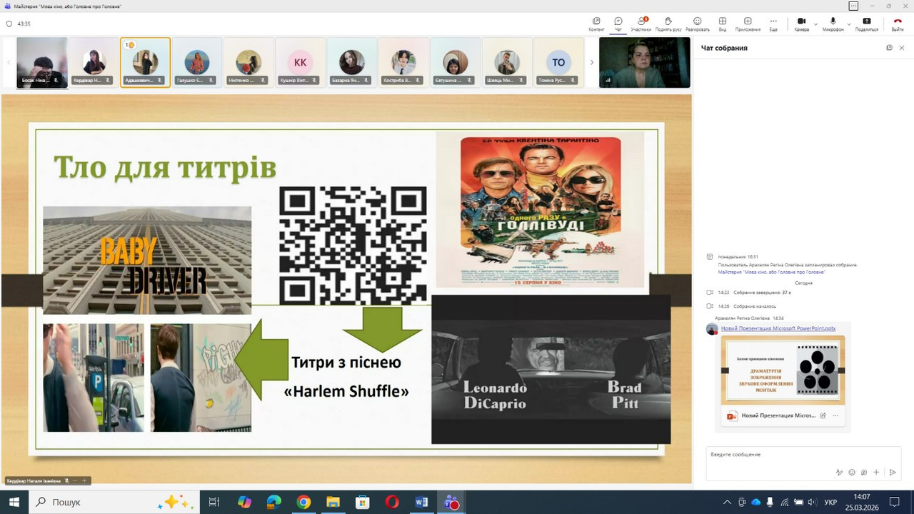 25 березня відбулася мотиваційна зустріч з доцентом кафедри української філології і МНФД, розробницею авторського курсу "Аудіовізуальна культура і масмедіа", що входить до переліку дисциплін ВК Університету Ушинського. У невимушеному форматі творчої майстерні "Мова кіно, або Головне про Головне" Жанна Дмитрівна поділилася секретами базових принципів кіномови, які дозволяють відстежити ту невловиму межу між кіномистецтвом і звичайним кінематографом: студійна заставка і титри, семіотика руху і простору, колірна драматургія, літературний кіноканон і т. под. На прохання зацікавлених слухачів цикл зустрічей творчої майстерні "Мова кіно, або Головне про Головне" буде продовжено. Стежте за анонсами наукового товариства студентів і МУ історико-філологічного факультету.