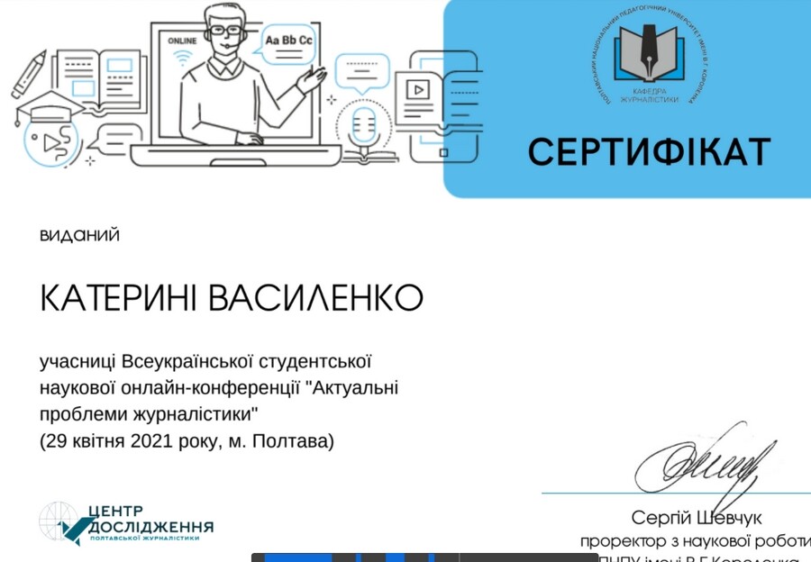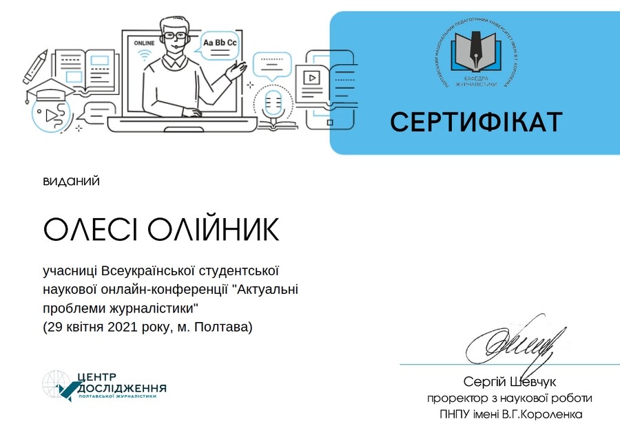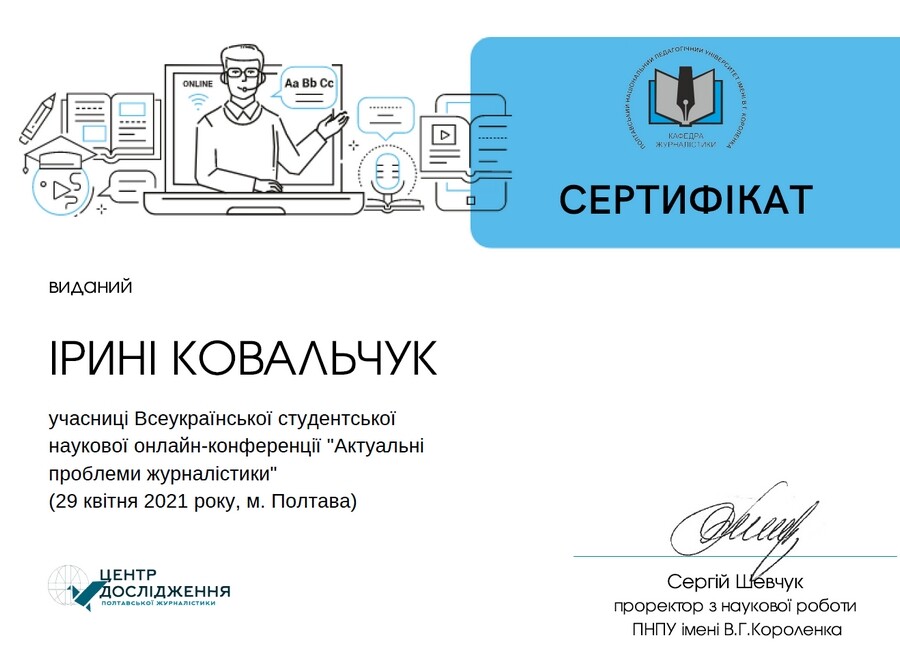Отож, рухаймося далі. 22 квітня на базі факультету філології та журналістики Полтавського національного педагогічного університету імені В.Г.Короленка в онлайн-форматі на платформі Google Meet відбулася Всеукраїнська студентська наукова конференція «Актуальні проблеми журналістики». Одеську команду доповідачів з філологічного факультету Університету Ушинського на чолі з доцентом кафедри української філології і методики навчання фахових дисциплін Ж.Д. Горіною представили: