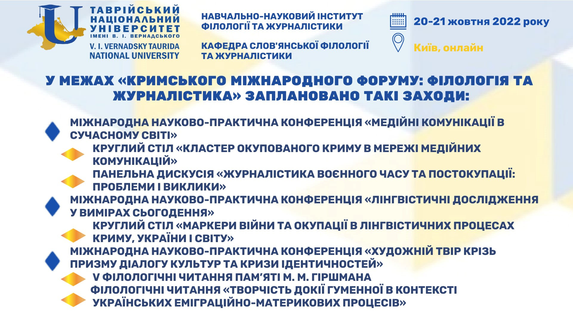 Упродовж двох насичених подіями днів головні питання дотримання професійних стандартів українських ЗМІ, протидії дезінформації у висвітленні воєнних подій, нагальні проблеми філологічного сьогодення і майбутнього було висвітлено в межах запланованих заходів Кримського форуму: міжнародної науково-практичній конференції «Медійні комунікації в сучасному світі» (Босак Н.Ф., Прокопенко Л.І., Горіна Ж.Д., Копусь О.А., Кон О.О., Ілясов О.О.), міжнародної науково-практичної конференції «Лінгвістичні дослідження у вимірах сьогодення» (Кучерява О.А., Крупеньова Т.І.), міжнародної науково-практичної конференції «Художній твір крізь призму діалогу культур та кризи ідентичностей» (Авксентьєва Г.А., Боєва Е.В.), круглих столів і філологічних читань, присвячених пам’яті М.М.Гіршмана і творчості Докії Гуменної в контексті українських еміграційно-материкових процесів, панельної дискусії «Журналістика воєнного часу та постокупації: проблеми і виклики», спікерами якої виступили:
