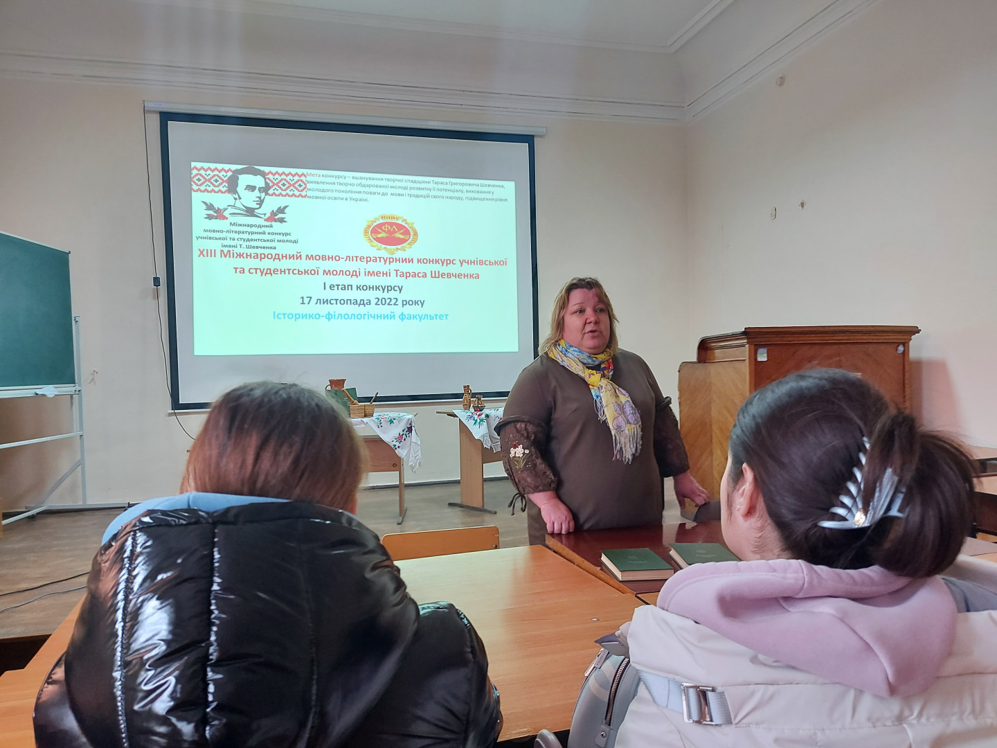 17 листопада відбувся перший етап ХІІІ Міжнародного мовно-літературного конкурсу учнівської та студентської молоді імені Тараса Шевченка. В урочистому відкритті взяли участь здобувачі й викладачі історико-філологічного факультету. Студенти першого курсу Ірина Лободенко, Анастасія Чучупака, Валерій Акімов, Олеся Кугут продекламували кращі поезії Тараса Шевченка. Студенти взяли участь у вікторині на знання лірики поета. Музичним подарунком для присутніх стала пісня про Кобзаря від чарівної гості заходу, учениці КМ «Біляївська мистецька школа» (керівник-Руденко О.В.) Марти Яцишиної.