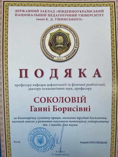 25 травня 2023 року, на засідання вченої ради Університету Ушинського було відзначено подякою за багаторічну сумлінну працю, визначні трудові досягнення, вагомий внесок у розвиток наукового потенціалу університету та з нагоди Дня науки: Форостян Ольгу Іванівну – завідувача кафедри дефектології та фізичної реабілітації, доктора педагогічних наук, професора та Соколову Ганну Борисівну – доктора психологічних наук, професора кафедри дефектології.