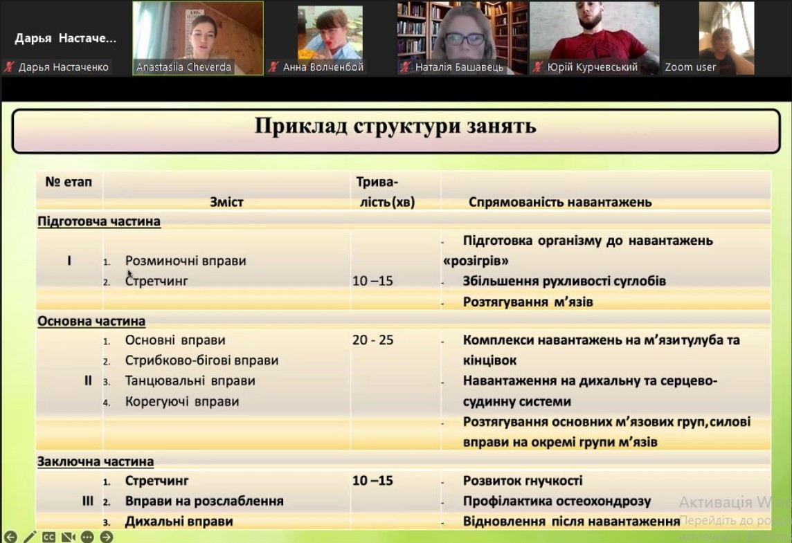 Магістри та викладачі кафедри теорії і методики фізичної культури та спортивних дисциплін, зокрема гарант ОПП 014 Середня освіта (Фізична культура), доктор педагогічних наук, професорка Башавець Н. А., кандидат наук з фізичного виховання та спорту, викладач кафедри гімнастики та спортивних єдиноборств Буховець Б. О., кандидат біологічних наук, доцент, Бондаренко О.В., кандидат філософських наук, доцент кафедри гімнастики та спортивних єдиноборств Погорелова О.О., активно брали участь у обговоренні питань розглянутих під час лекції та висловили щиру подяку шановній Чеверді А.О. за цінний матеріал, який був презентований.