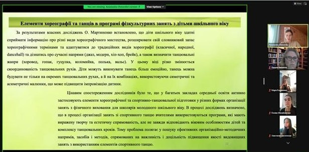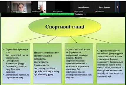 На прикладі наявних досліджень лекторкою було продемонстровано вплив фізкультурних занять з елементами спортивних танців на показники фізичного розвитку, функціонального стану серцево-судинної та дихальної системи, постави, фізичної підготовленості, працездатності дітей шкільного віку.