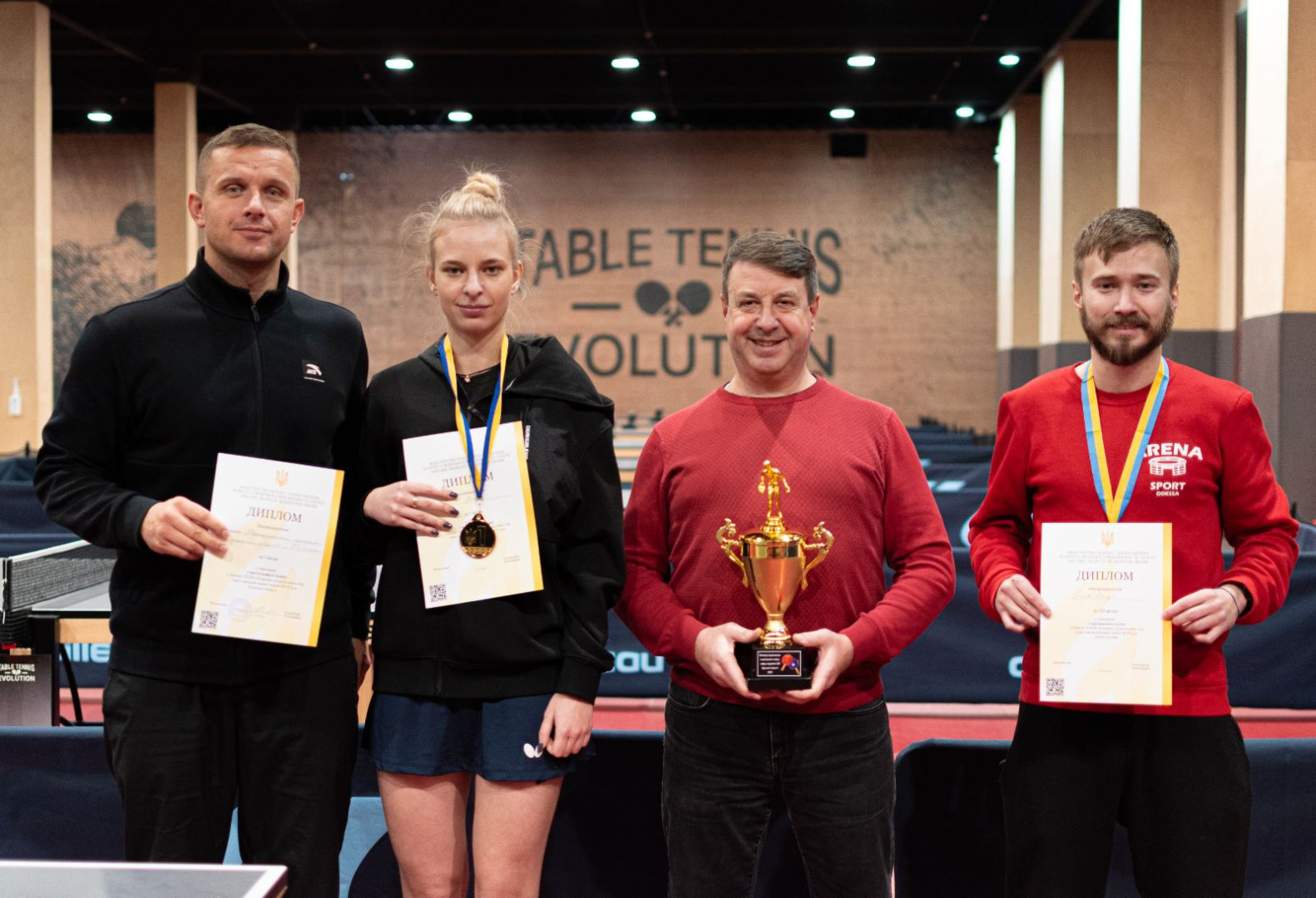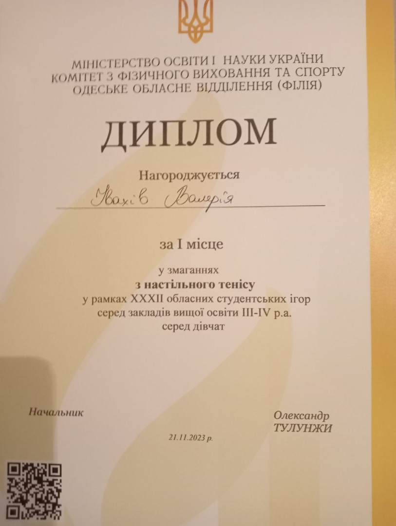 21.11.2023р. відбулися ХХХІІ обласні студентські ігри серед закладів вищої освіти ІІІ - ІV р. а. Одеської області з настільного тенісу, де команда Університету Ушинського здобула 1 місце в загальному заліку! Серед юнаків ІІІ місце посів студент 3 курсу 1 гр. інституту фізичної культури, спорту та реабілітації, кандидат в майстри спорту України з настільного тенісу Петухов Валерій, а серед дівчат І місце посіла випускниця факультету іноземних мов, майстер спорту України з настільного тенісу Івахів Валерія. Тренер команди к. пед. н., старший викладач кафедри теорії і методики фізичної культури та спортивних дисциплін Кучеренко Г. В. ВІТАЄМО переможців і бажаємо подальших спортивних досягнень!!!