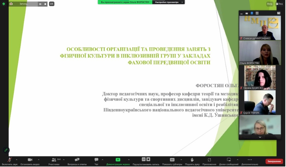 Перед учасниками семінару виступила Ольга Форостян, доктор педагогічних наук, завідувач кафедри спеціальної та інклюзивної освіти і реабілітації, професор кафедри теорії і методики фізичної культури і спортивних дисциплін Південноукраїнського національного педагогічного університету імені К.Д. Ушинського. Тема доповіді: «Особливості організації та проведення занять з фізичної культури в інклюзивній групі у закладах фахової передвищої освіти».