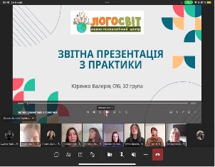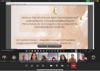 Практиканти презентували результати проходження практики на платформі Teams з використанням мультимедійних презентацій. Сучасний стан підвищеної тривожності і труднощів, повʼязаних з умовами воєнного стану показав високий рівень спроможності активізувати сили і бажання у пошуку нового, цікавого, професійного рівня, здобувачі освіти успішно виконали всі надані завдання практики, зокрема ознайомились з практичними уміннями та навичками роботи педагогів, логопедів в закладах освіти з дітьми з ООП, поділились набутим досвідом та думками, цікавими ідеями, здійснили самооцінку щодо сформованості професійної компетенції та їх готовності працювати з дітьми в складних, непередбачуваних умовах. Майбутні педагоги продемонстрували сумлінність та креативно-творчий підхід до виконання поставлених завдань, зробили цікаві висновки, пропозиції, доповіді відрізнялись змістовністю, оригінальністю та інформативністю.