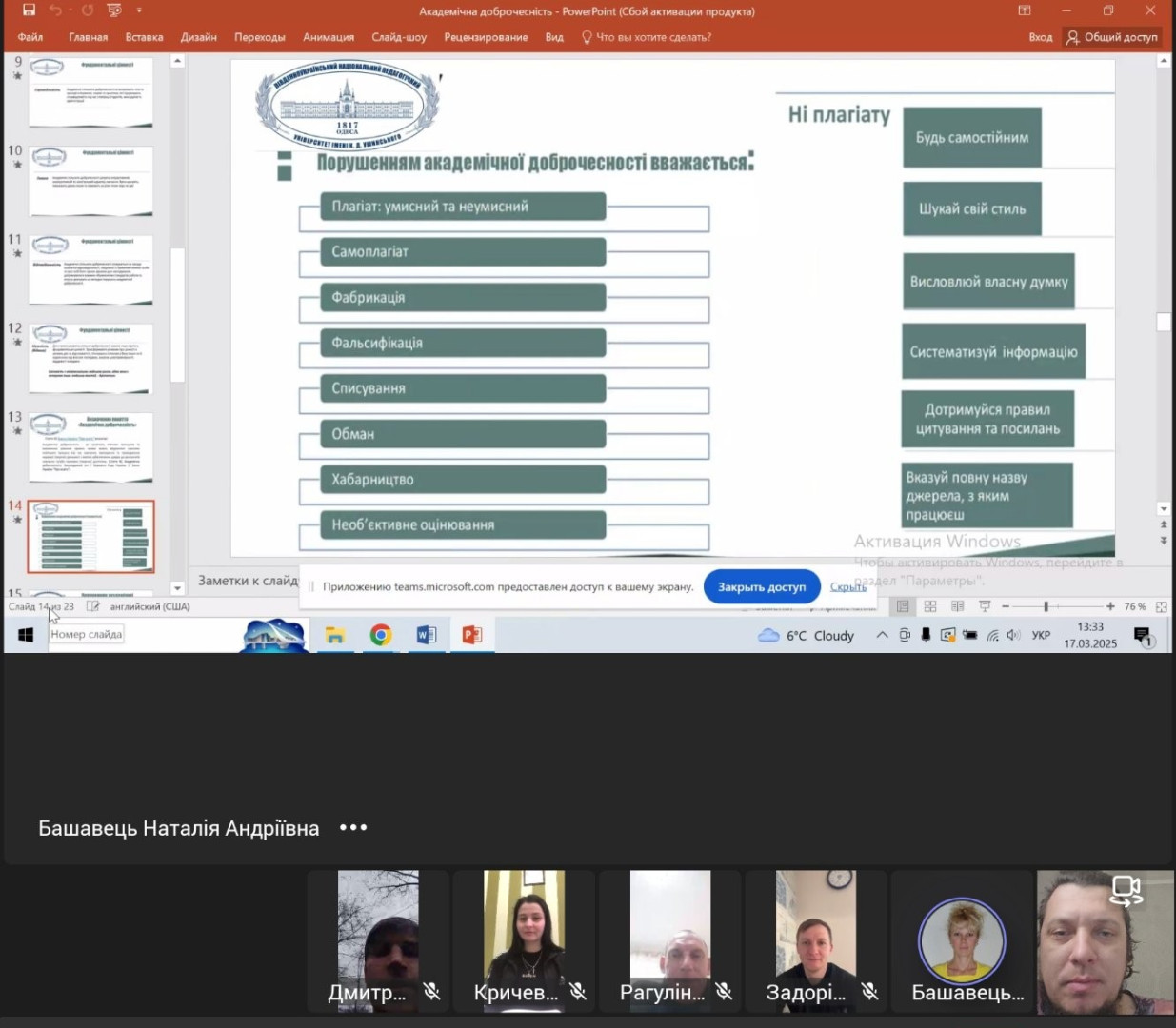 20 березня 2025 року магістранти ОПП Середня освіта (Фізична культура) також долучилися до участі у воркшопі «Академічна доброчесність: сучасні реалії та виклики» який провела доктор педагогічних наук, професор, завідувач кафедри педагогіки Княжева І.А. Захід об’єднав здобувачів та науково-педагогічних працівників, які прагнуть дотримуватися високих стандартів наукової етики та якості освіти.