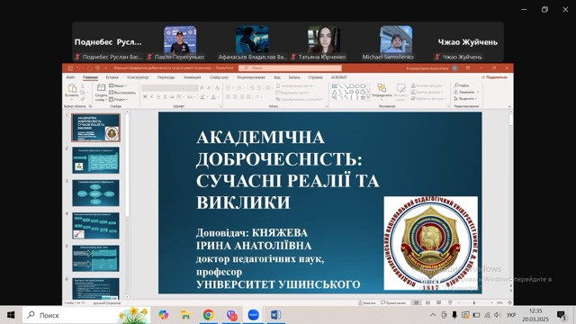17 березня 2025 року у межах тижня доброчесності було проведено семінар «Концепт категорії академічної доброчесності у вищій освіті» для здобувачів другого (магістерського) рівня вищої освіти ОПП Середня освіта (Фізична культура). Захід організувала та провела Башавець Н. А. (гарант ОПП ) професор кафедри теорії і методики фізичної культури та спортивних дисциплін.