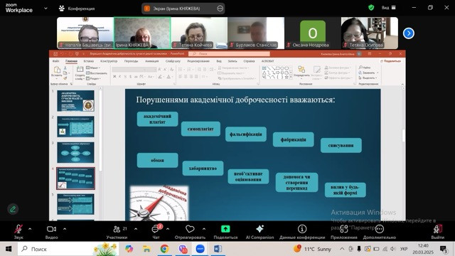 У межах воркшопу обговорювалися ключові принципи академічної доброчесності, зокрема, етичні аспекти наукової діяльності, уникнення плагіату, відповідальність за достовірність результатів досліджень. Учасники мали змогу ознайомитися з актуальними викликами у сфері академічної етики, включно із використанням цифрових технологій у дослідницькій діяльності та забезпеченням прозорості наукових публікацій. Спікер акцентувала увагу на важливості формування культури академічної доброчесності в освітньому середовищі, навела реальні приклади порушень та їх наслідки, а також запропонувала ефективні стратегії для дотримання етичних норм у науці.