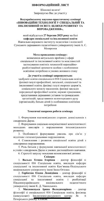 Горбатюк Олена Леонідівна, асистент кафедри спеціальної та інклюзивної освіти і реабілітації взяла участь у Всеукраїнському науково-практичному семінарі «Інноваційні технології у спеціальній та інклюзивній освіті: шляхи розвитку та впровадження», організованому кафедрою спеціальної та інклюзивної освіти Сумського державного педагогічного університету імені А. С. Макаренка. Семінар відбувся 27 березня 2025 року.