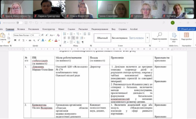 У засіданні взяли участь: Соколова Ганна Борисівна – гарант ОПП, директор навчально-наукового інституту фізичної культури, спорту та спеціальної освіти, доктор психологічних наук, професор, член-кореспондент НАПН України; Члени робочої групи: Форостян Ольга Іванівна – завідувач кафедри, доктор педагогічних наук, професор; Галущенко Вікторія Іванівна – кандидат педагогічних наук, доцент; Орленко Ірина Миколаївна – доктор філософії, доцент; Горбатюк Олена Леонідівна – доктор філософії, асистент кафедри спеціальної та інклюзивної освіти; Хівренко Тетяна Русланівна – здобувачка ОПП «Спеціальна освіта (Логопедія)», 3 курс; Мефодьєва Аліна Сергіївна - здобувачка ОПП «Спеціальна освіта (Логопедія)», 2 курс; та зовнішні стейкхолдери: Григор’єва Лариса Вікторівна – директор Одеської спеціальної школи №75; Лінюшина Марина Олексіївна – директор ЗДО №174 комбінованого типу м. Одеса; Кривоногова Оксана Валеріївна – кандидат психологічних наук, доцент, голова ГО «Здорове суспільство», національна тренерка з раннього втручання.