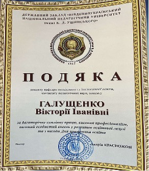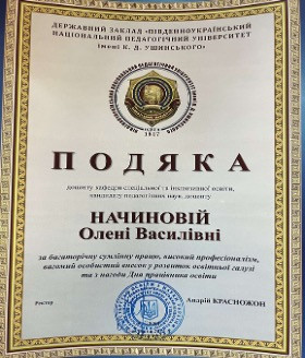 25 вересня 2025 року, на засідання вченої ради Університету Ушинського було відзначено подякою за багаторічну сумлінну працю, високий професіоналізм, вагомий особистий внесок у розвиток освітньої галузі та з нагоди Дня працівника освіти: Начинову Олену Василівну – кандидата педагогічних наук, доцента кафедри спеціальної та інклюзивної освіти та Галущенко Вікторію Іванівну - кандидата педагогічних наук, доцента кафедри спеціальної та інклюзивної освіти.
