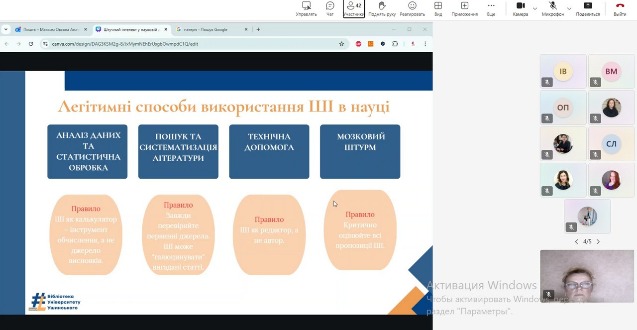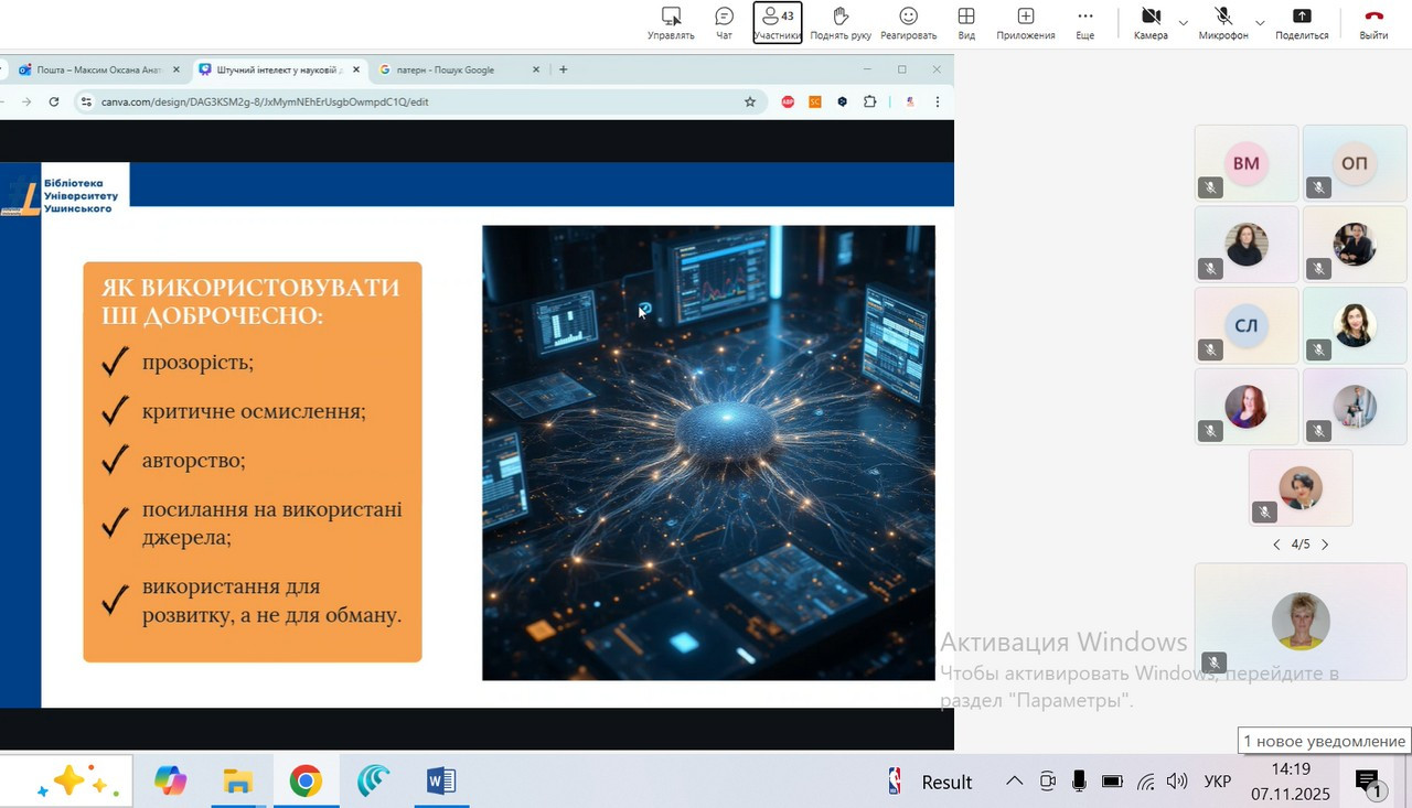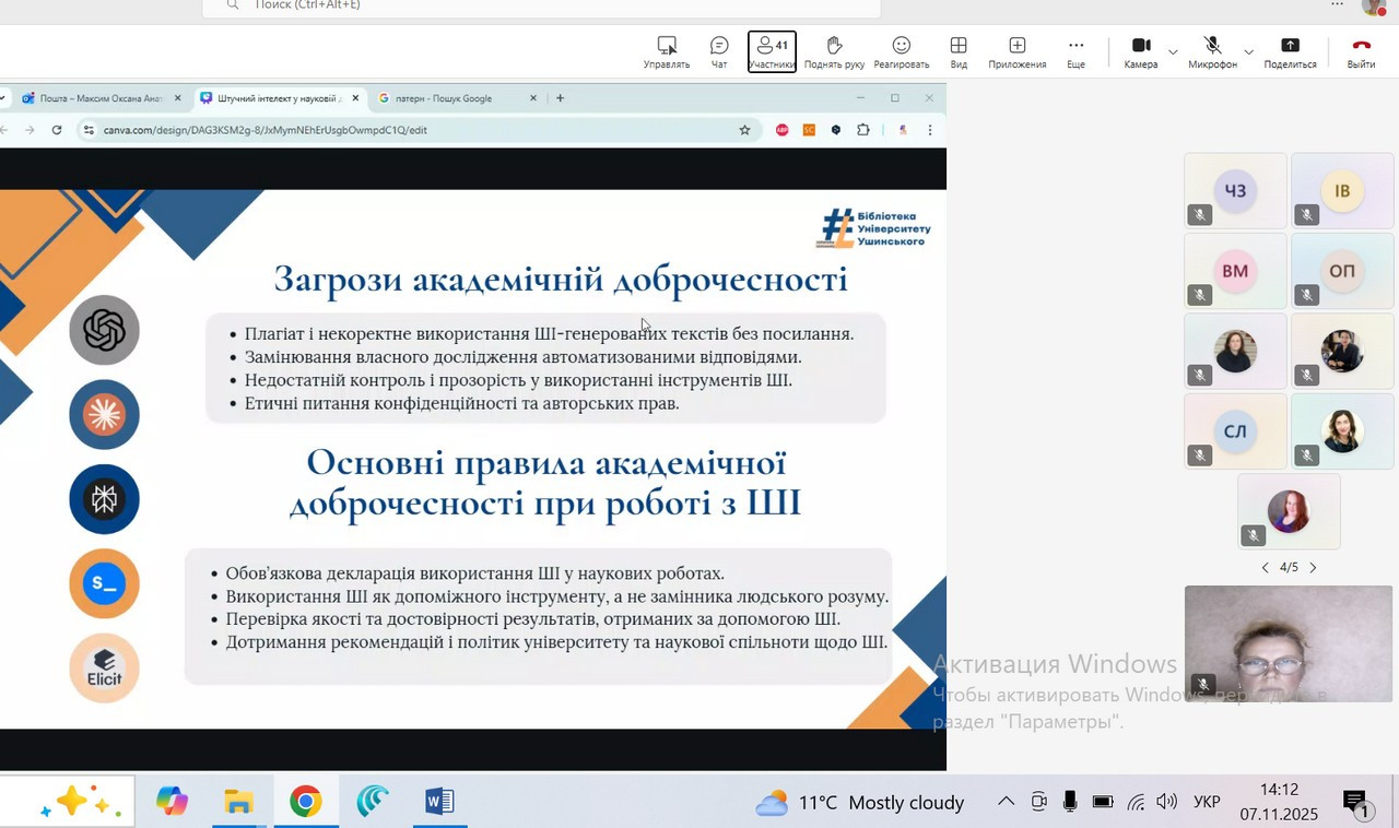 У межах лекції розглядалися основні напрями застосування ШІ в науковій діяльності, переваги та потенційні ризики його використання. Окрему увагу приділено етичним аспектам взаємодії з інтелектуальними системами, правилам посилання на матеріали, створені за допомогою ШІ, та практичним рекомендаціям щодо забезпечення прозорості й відповідальності в наукових роботах.