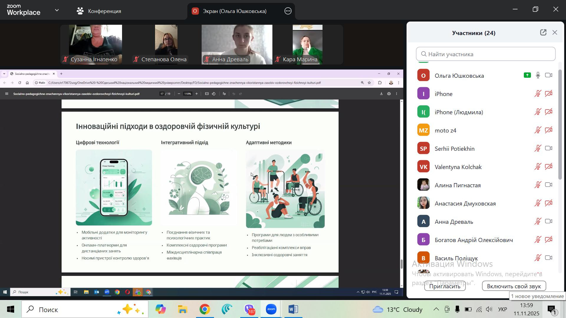 У своєму виступі Ольга Геннадіївна Юшковська розкрила актуальність використання засобів оздоровчої фізичної культури в освітньому процесі, зважаючи на зростання соціального запиту на підвищення рівня здоров’я населення в умовах стресогенних факторів сучасного життя. Лекторка охарактеризувала основні напрями застосування різних засобів оздоровчої фізичної культури, зокрема аеробних вправ, силових тренувань, вправ на розвиток гнучкості та дихальних практик.