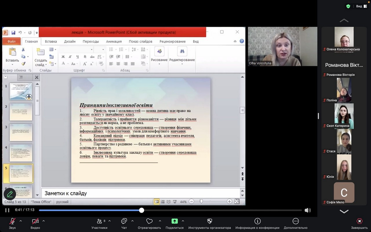 У лекції були розглянуті питання щодо бар’єрів та викликів в інклюзивній освіті, розгортались принципи та перспективи напрямів розвитку.