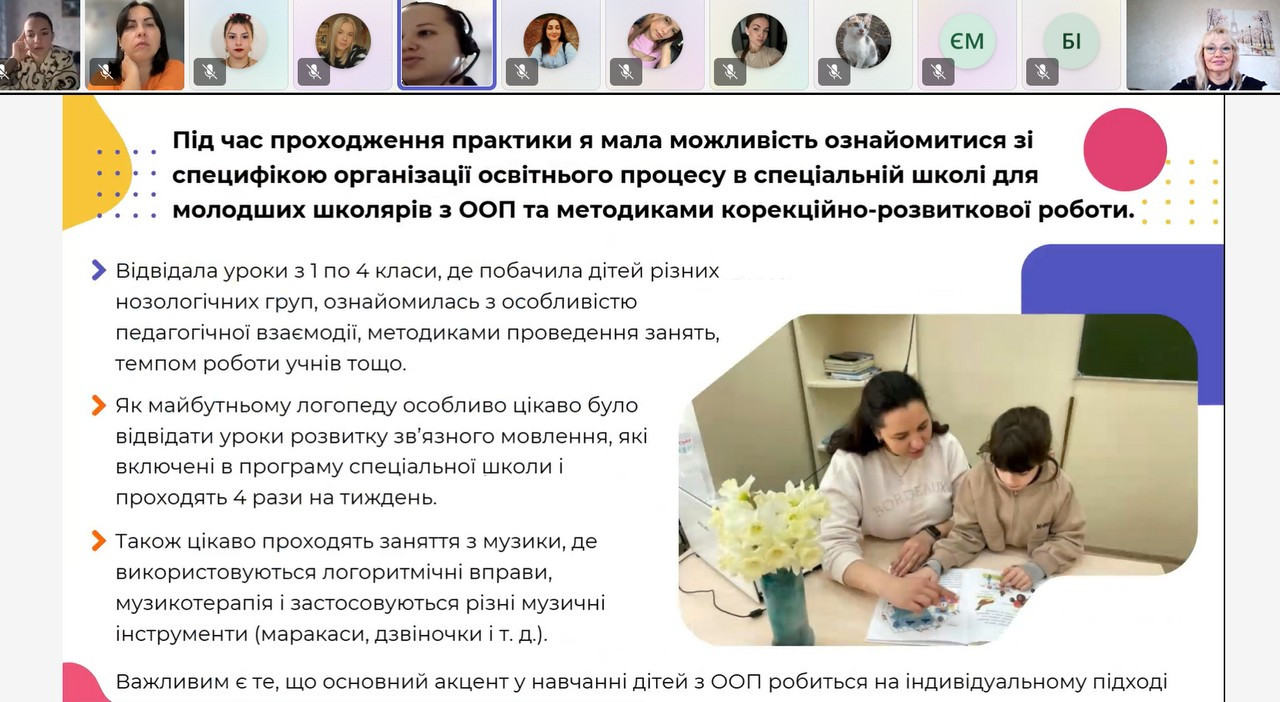 Студенти з радістю та захопленням розповідали про особливості проходження навчальної ознайомлювальної практики, де вони вперше мали змогу долучитись до комплексного обстеження, спостереження, сумісного виконання цікавих корекційних вправ та участі у проведенні занять.