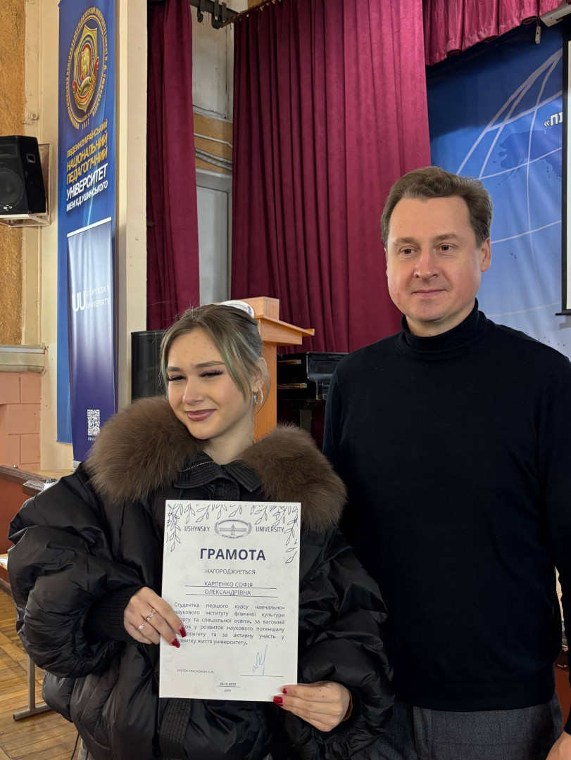 Грамотами за вагомий особистий внесок у розвиток наукового потенціалу університету, активну участь у формуванні студентського середовища та відповідальну громадянську позицію нагороджено студенток першого курсу Навчально-наукового інституту фізичної культури, спорту та спеціальної освіти: Карпенко Софію Олександрівну, Пасенченко Анастасію Романівну, Шпильову Катерину Євгенівну, Пересулько Марʼяну Дмитрівну, Тимошенко Анну Максимівну.