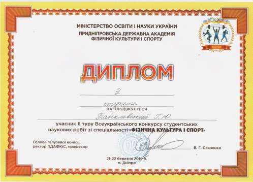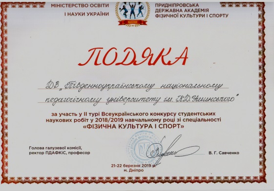 Студенти Навчально-наукового інституту фізичної культури, спорту та реабілітації Танклевський Гліб та Сидор Сергій взяли участь у ІІ турі Всеукраїнського конкурсу студентських наукових робіт зі спеціальності «Фізична культура і спорт», який відбувся 22 березня 2018 року в Придніпровській державній академії фізичної культури і спорту.
