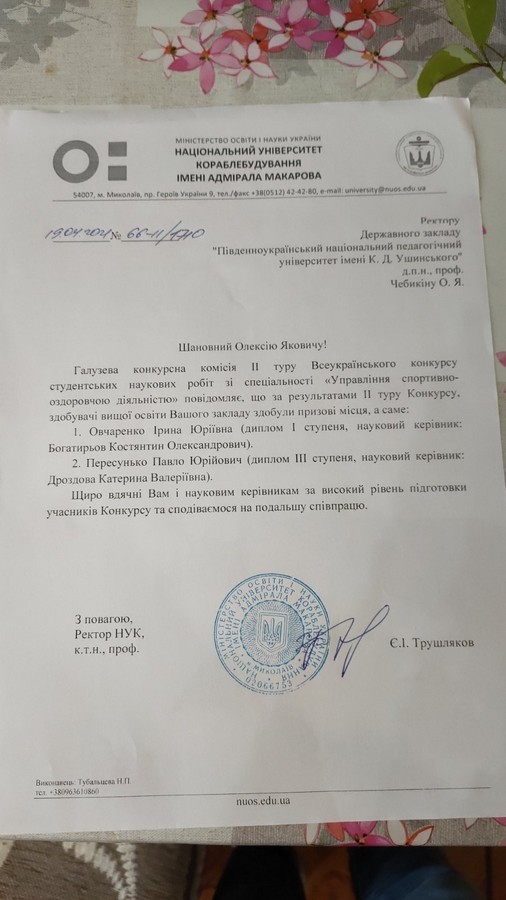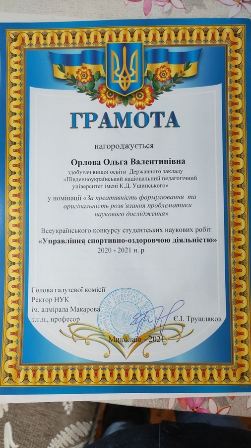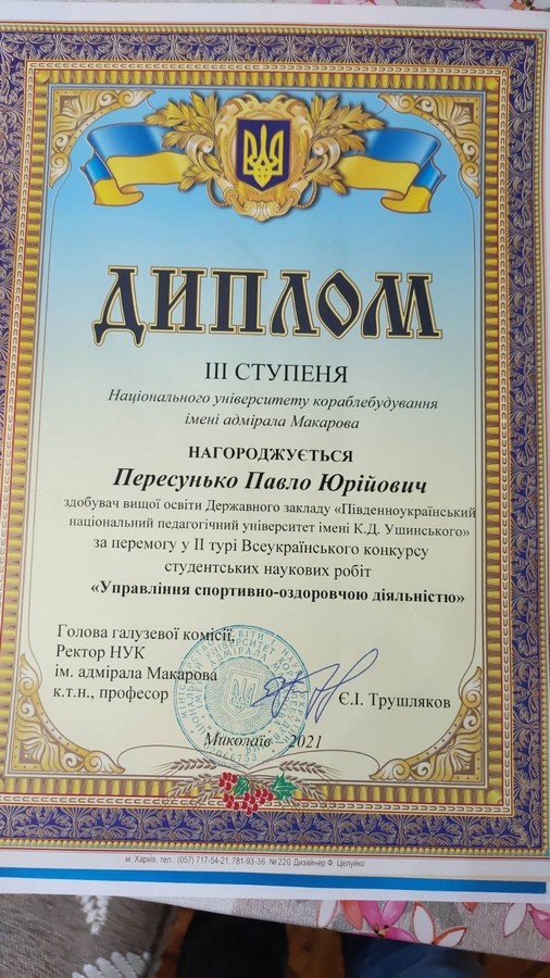 6 квітня 2021 року у м. Миколаєві відбувся 2 тур Всеукраїнського конкурсу студентських наукових робіт «Управління спортивно-оздоровчою діяльністью». За результатами конкурсу диплом третього ступеня отримал Пересунько Павло Юрийович, студент 1 року навчання здобувач вищої освіти за першим (бакалаврським) рівнем за спеціальністю 014 Середня освіта (Фізична культура) Навчально-наукового інституту фізичної культури, спорту та реабілітації Університету Ушинського з роботою «Формування пріоритетів у використанні здоров’язбережувальної педагогічної технології з фізичної культури на основі врахування особливостей розвитку дітей 7-9 років». Науковий керівник: кандидат педагогічних наук, старший викладач кафедри теорії і методики фізичної культури та спортивних дисциплін Дроздова Катерина Валеріївна. Вітаємо наших студентів та їх керівників, з побажанням наступних перемог!
