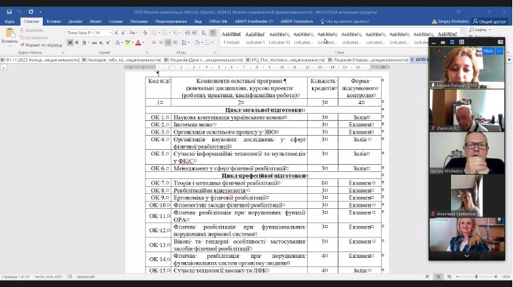 10 квітня 2023 року на розширеному засіданні кафедри біології і охорони здоров’я Університету Ушинського відбулося громадське обговорення проєкту освітньо-професійної програми Фізична реабілітації другого (магістерського) рівня вищої освіти. Після привітального слова завідувача кафедри, кандидата біологічних наук, Марії Сергіївни Топчій, гарант Сергій Анатолійович Холодов, доктор педагогічних наук, доцент, приват-професор кафедри біології і охорони здоров’я представив проєкт освітньо-професійної програми. Він докладно зупинився на компетентностях, програмних результатах навчання і освітніх компонентах, які їх забезпечуватимуть. В обговоренні прийняли участь стейголдери: Володимир Сергійович Лизогуб, доктор педагогічних наук, професор, професор кафедри анатомії, фізіології і фізичної реабілітації Черкаського національного університету імені Богдана Хмельницького; Алла Василівна Бурлака, директор КУ «Одеський інклюзивно-ресурсний центр № 8», Оксана Юріївна Костюк, директор Медико-корекційного центру «Лепрекон+», які висловили свою думку щодо актуальності даної освітньої програми, грамотного її оформлення, а також надали пропозиції задля покращення якості забезпечення освітньої програми. Додатково мали змогу виступити співробітники кафедри, а також науково-педагогічні працівники університету.