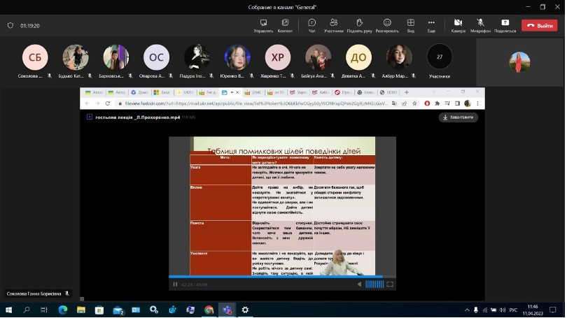 11 квітня 2023 року в межах дисципліни «Спеціальна психологія» для здобувачів першого (бакалаврського) рівня першого року навчання спеціальності 016 Спеціальна освіта було проведено лекцію «Особлива дитина у родині: переорієнтування цілей небажаної поведінки».