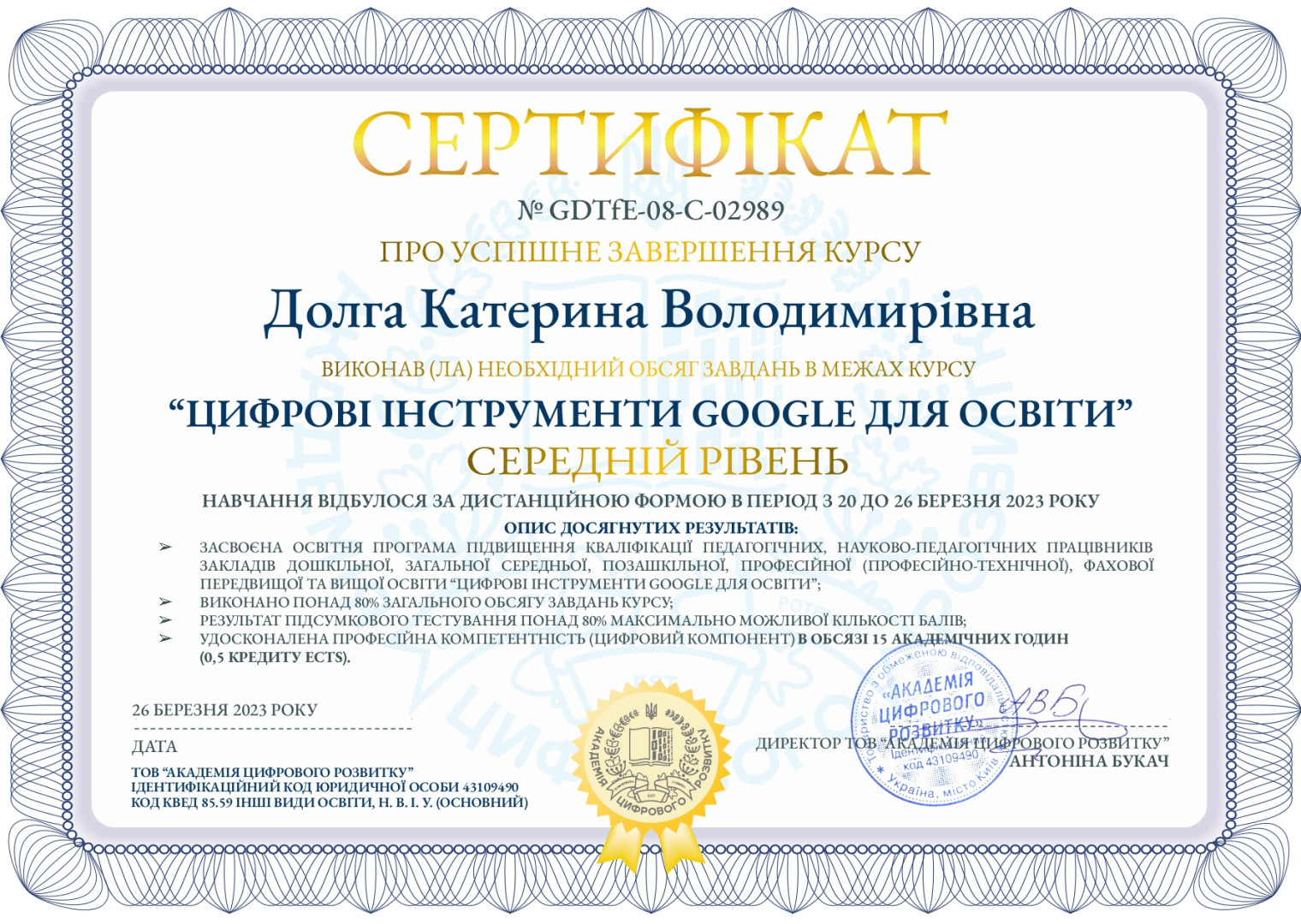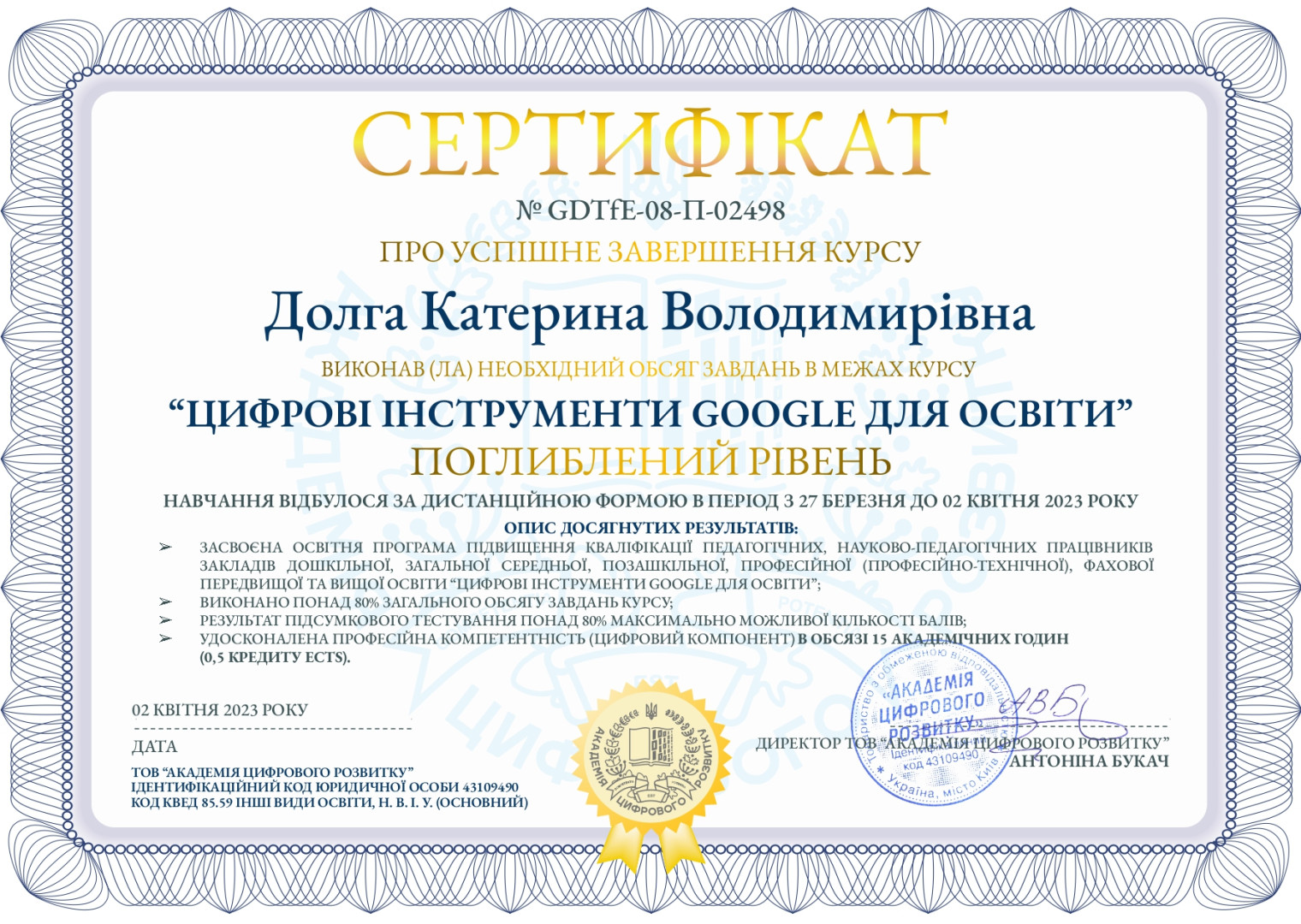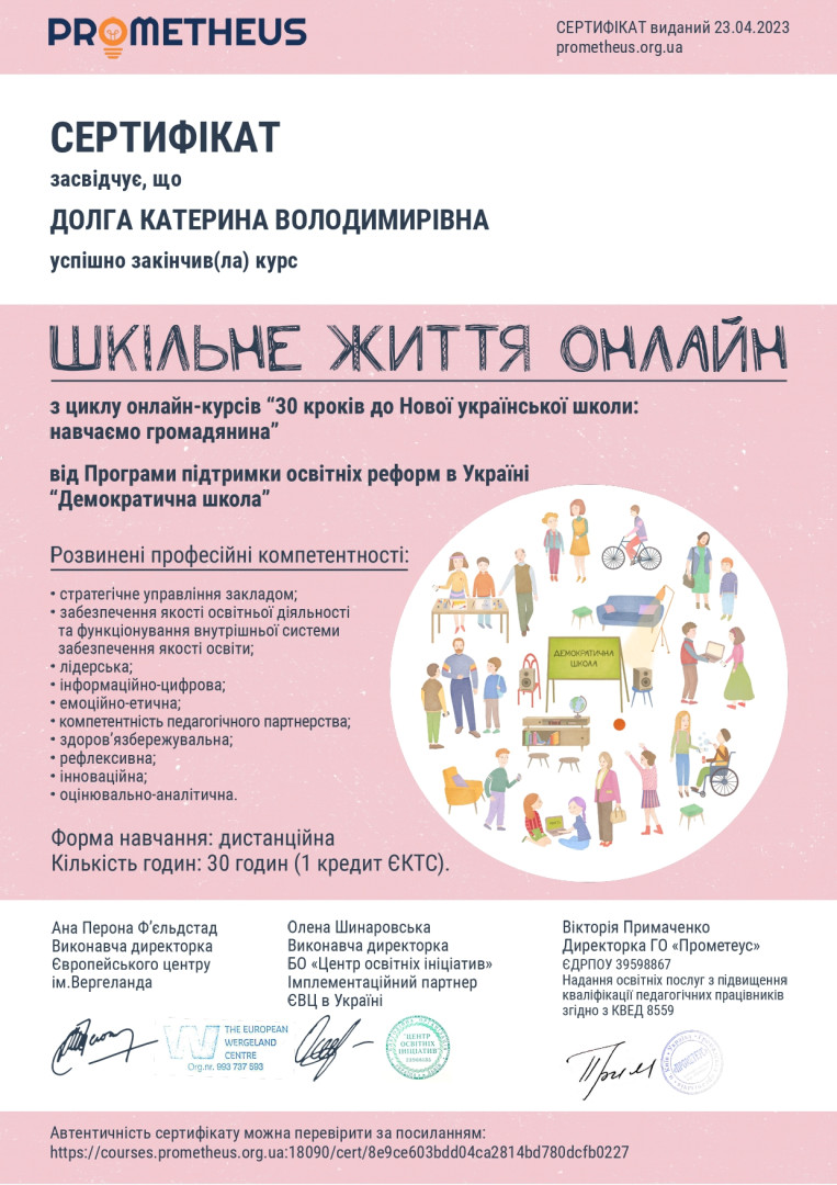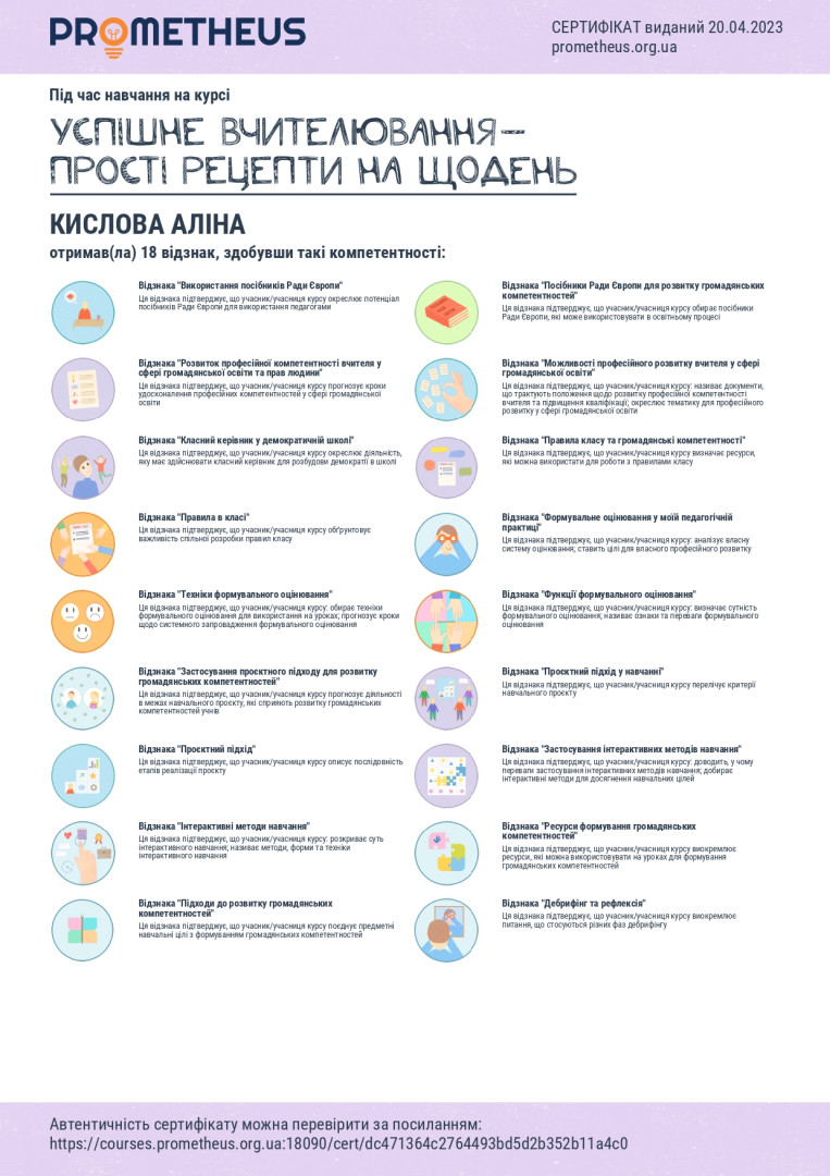 Настаченко Дар'я успішно закінчила курс «Наука про навчання: що має знати кожен вчитель?» teachers college (Колумбійський університет, США), Кислова Аліна успішно закінчила курс «Успішне вчителювання – прості рецепти нащодень», Долга Катерина успішно закінчила курси «Шкільне життя онлайн», “Цифрові інструменти google для освіти” різного рівня Магістрантки протягом березня та квітня 2023 року пройшли навчання на освітній платформі «Прометеус» з отриманням сертифікатів та перезарахували результати навчання з відповідних тем в межах ОК 11 «Методологічні аспекти підготовки вчителів фізичної культури».