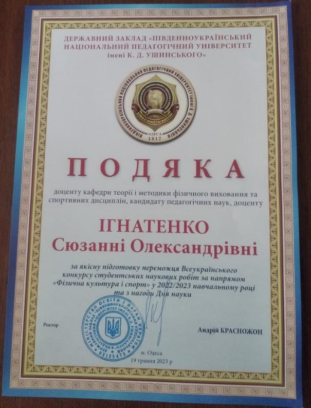 ДИПЛОМ I СТУПЕНЯ отримала Кислова Аліна Русланівна здобувачка другого (магістерського) рівня вищої освіти спеціальності 014 Середня освіта (Фізична культура), тема роботи: «Сучасні підходи до формування здорового способу життя у студентів», керівник - Дроздова Катерина Валеріївна, старший викладач кафедри теорії і методики фізичної культури та спортивних дисциплін.