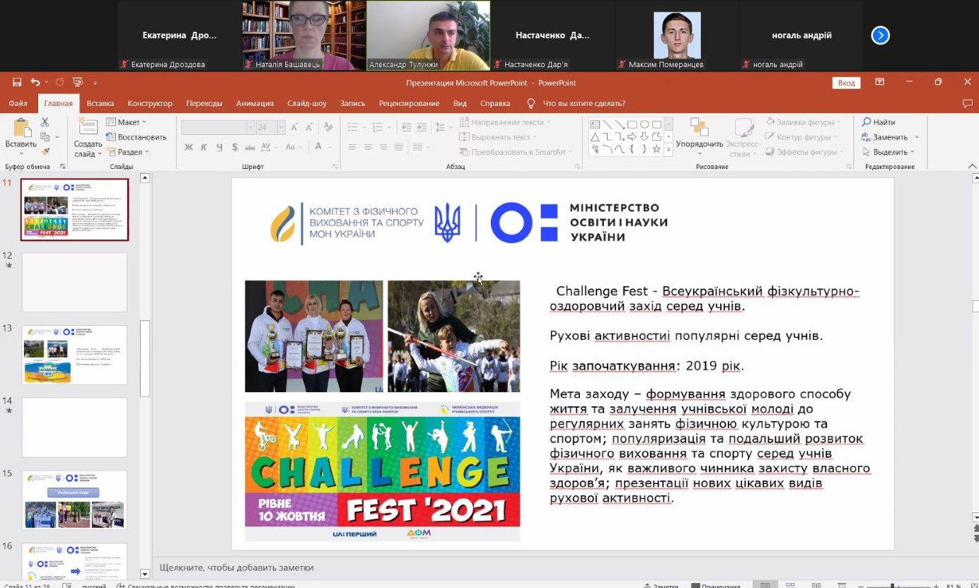 На онлайн-семінарі з теми "Сучасні вимоги до професійної діяльності вчителя фізичної культури щодо організації спортивно-масової та фізкультурно-оздоровчої роботи з молоддю" Тулунжи О.П. розкрив питанням використання сучасних аспектів організації спортивно-масової та фізкультурно-оздоровчої діяльності вчителя фізичної культури, які передбачають оволодіння новітніми модулями з різних видів фізичної активності, проведення різноманітних заходів (COOL GAMES, COMBAT GAMES, BEACH GAMES, COOL RACE, CHALLENGE FEST, КОЗАЦЬКА ЛІГА, КОЗАЦЬКИЙ ГАРТ, РУХ - ЦЕ ЗДОРОВО, ОЛІМПІЙСЬКЕ ЛЕЛЕЧЕНЯ тощо), наставництво щодо фізичного виховання в домашніх умовах, залучення молоді до учнівського спорту (Гімназіада України, Чемпіонати України серед школярів з видів спорту) або студентського спорту (Універсіада України, Чемпіонати України серед студентів з видів спорту), участь у Спартакіаді серед вчителів фізичного виховання закладів освіти, національно-патріотичне виховання молоді, створення та запровадження он-лайн челенджів серед учнівської та студентської молоді тощо.