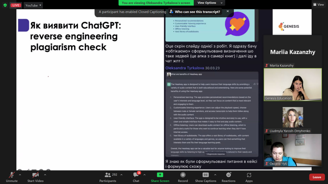 20 червня 2023 року гарант, науково-педагогічні працівники та здобувачі ОНП Психологія прийняли участь у воркшопі «Як ChatGPT може асистувати під час створення навчальної програми або освітньої траєкторії» від Олександри Тиркалової, Partnership with Universities Lead у Genesis.
