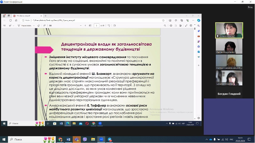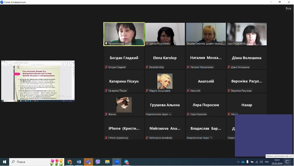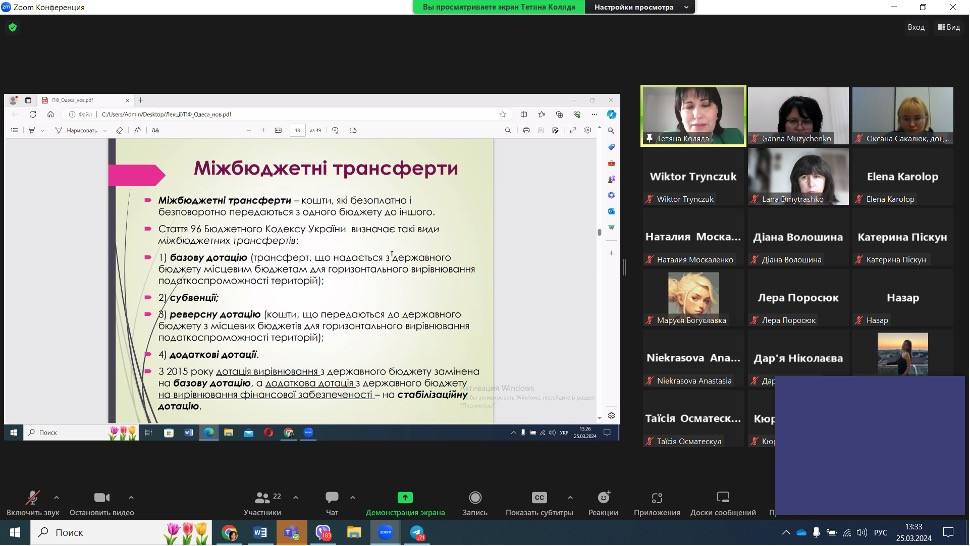 25 березня 2024 року студенти-політологи та викладачі кафедри політичних наук і права Університету Ушинського доєдналися до гостьової лекції кандидата економічних наук, старшого наукового співробітника, доцента кафедри фінансів Державного податкового університету Тетяни КОЛЯДИ на тему «Зростання ролі територіальних громад у формуванні фінансового простору України в умовах децентралізації влади».