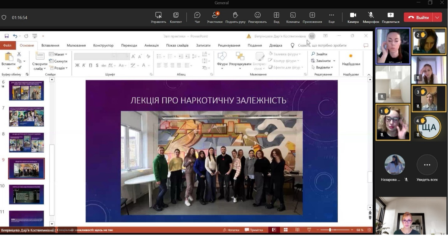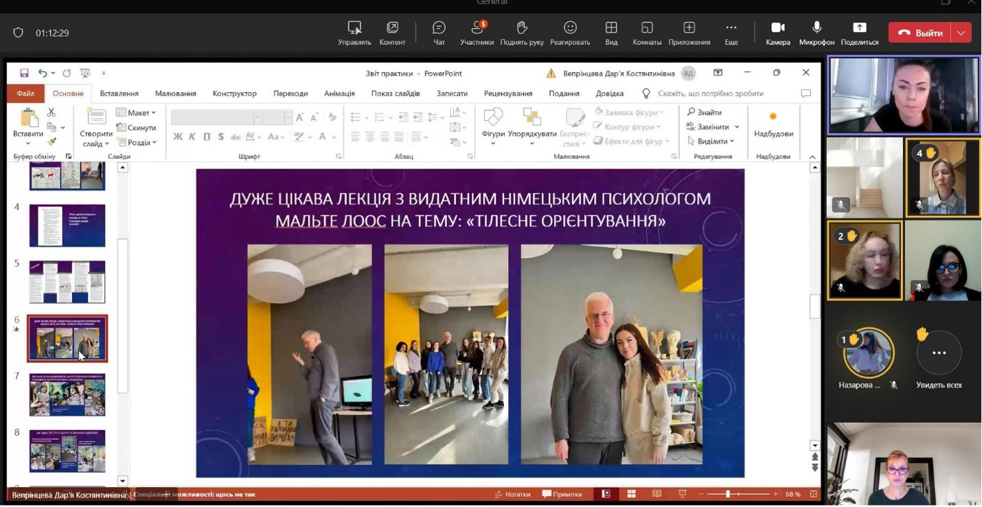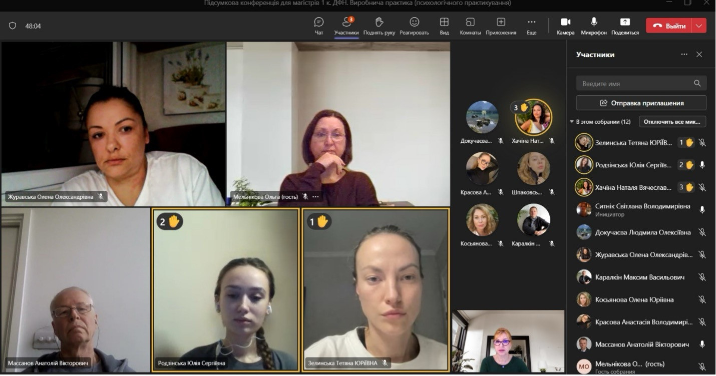 27-28 березня 2024 року було проведено підсумкову конференцію з виробничої практики (психологічного практикування) для магістрів першого курсу денної та заочної форм навчання за ОПП «Практична психологія. Екстремальна та кризова психологія». Головної метою проходження такої практики було закріплення теоретичних знань та набуття практичних навичок роботи психолога в екстремальних та кризових ситуаціях.Під час проходження практики у здобувачів було сформовано навички різних видів просвітницької, організаційної роботи, виконання індивідуально-навчального дослідного завдання, психодіагностики, психотерапії, психокорекції тощо. Також було сформовано певні професійні компетенції майбутніх фахівців, вони здобули необхідні знання у таких сферах, як психосоматична допомога під час стресу, ресурсні практики арттерапії, психологічна допомога дітям тощо. Здобувачі отримали індивідуальні та групові консультації своїх керівників від баз практики. Протягом проходження практики магістри відвідали наступні заходи: лекцію «Робота психолога з залежними», «Цілеспрямованість та мотивація: розкрийте свій потенціал», «Ідентифікація себе і її вплив на поведінку і оточення»; лекцію на тему «Взаємозв’язок тілесних і когнітивних реакцій, спікер Мальте Лоос (Німеччина) системний психотерапевт «Inner stille» (м. Берлін); тренінгові заняття «Впевненість у собі та довіра до себе», «Конфлікт: види і способи подолання»; практичне заняття з підлітками, що живуть з цукровим діабетом в рамках співпраці з Дитячим консультативно-діагностичним центром імені академіка Б.Я. Резніка. Як зауважили учасники конференції, їм вдалося відчути себе справжніми практичними психологами, оволодіти відповідними професійними компетенціями, віднайти напрямки власного професійного зростання.