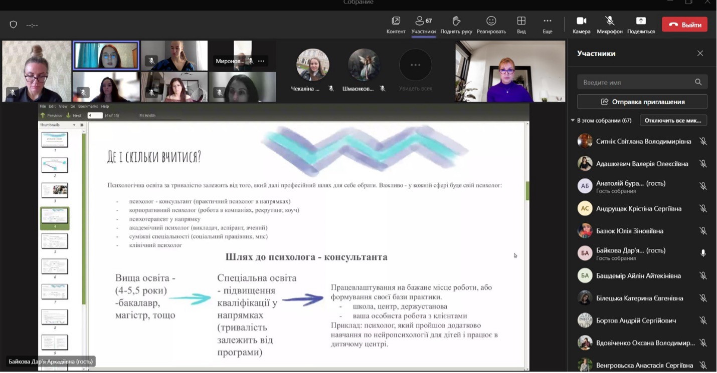 8 травня 2024 року відбувся вебінар Дар'ї Байкової "Шлях психолога у сучасності", організований кафедрою теорії та методики практичної психології Університету Ушинського. Спікер вебінару є випускницею бакалавріату та магістратури Університету Ушинського за спеціальністю 053 Психологія. Вебінар зібрав широку аудиторію здобувачів-психологів всіх рівнів вищої освіти та викладачів психологічних кафедр Університету.
