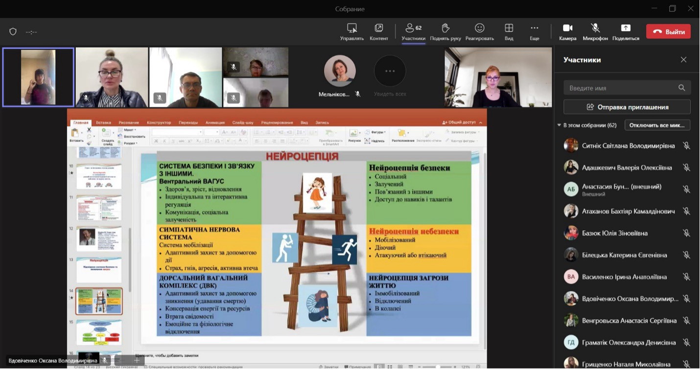 Спікерка окреслила способи збереження ментального здоров’я; особливості психологічної травми; основні реакції на травматичні події; нейроцепцію як систему безпеки виявлення загроз; саморегуляцію організму.