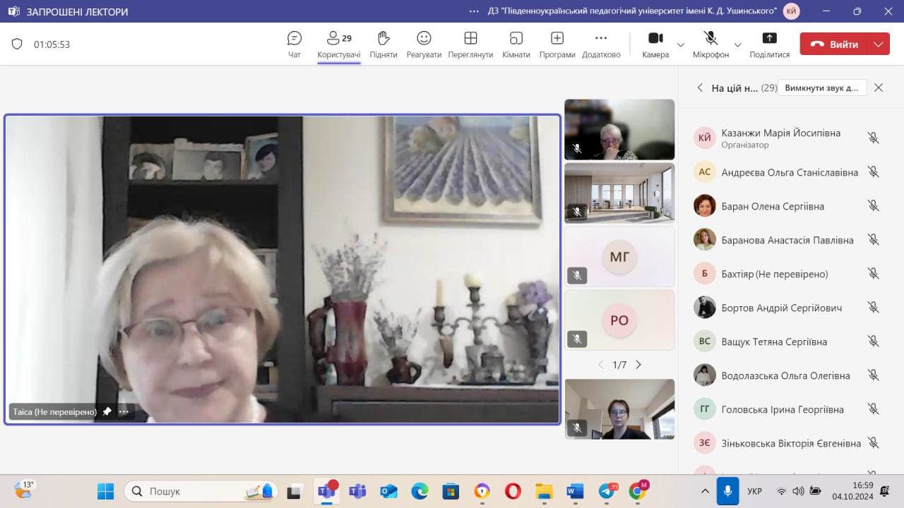 4 жовтня 2024 року в онлайн-форматі на платформі Teams відбулась гостьова лекція кандидата психологічних наук, доцента, доцента кафедри загальної психології Київського національного університету імені Т.Г.Шевченка, заслуженої працівниці освіти України Таїсії Сергіївни Кириленко.