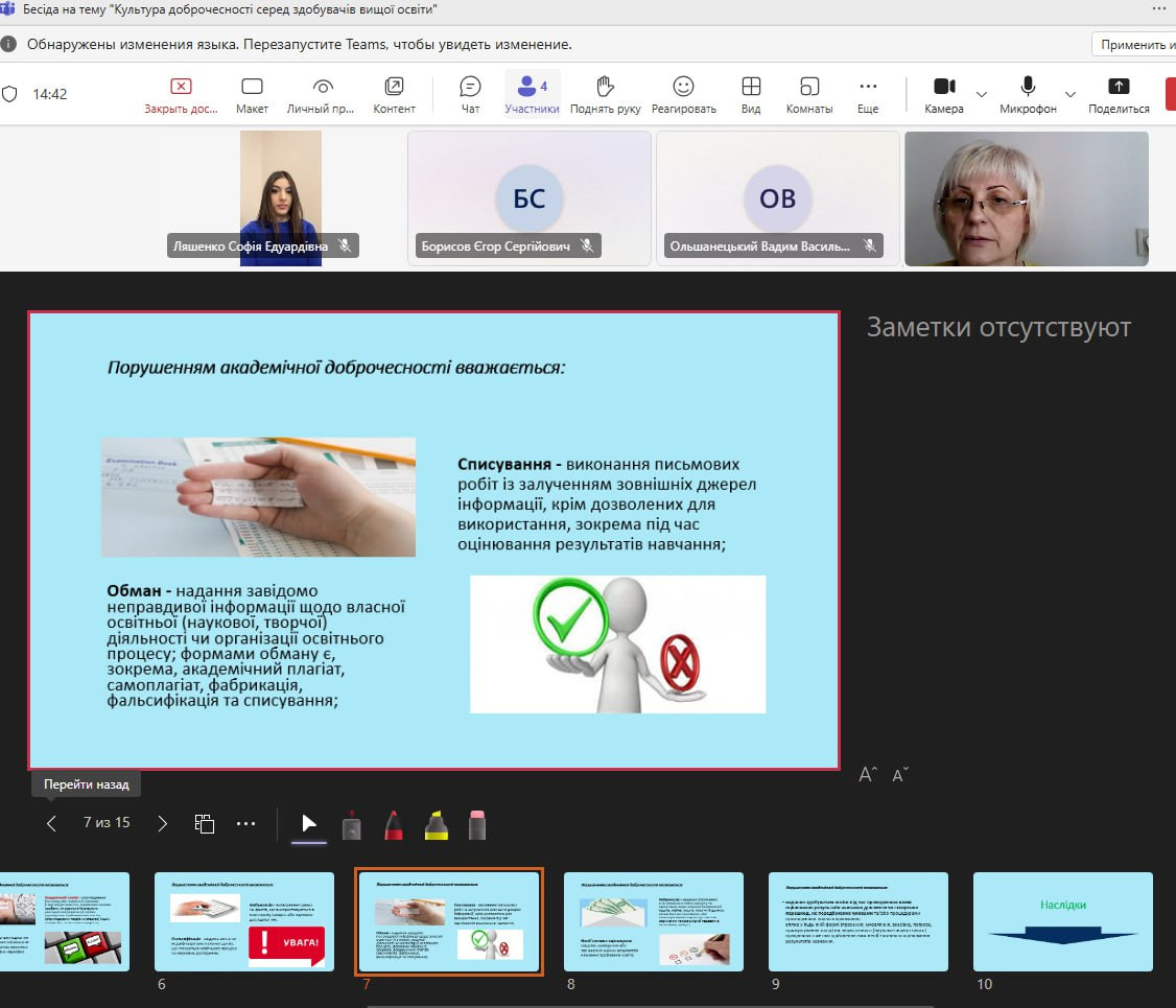 19 березня 2025 року у межах Тижня доброчесності в Університеті Ушинського зі студентами першого року навчання першого (бакалаврського) рівня вищої освіти спеціальності 052 Політологія проведено тематичну бесіду на тему «Культура доброчесності серед здобувачів вищої освіти».