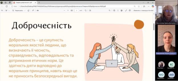 19 березня на кафедрі теорії та методики практичної психології в межах Тижня доброчесності відбулася кураторська година на тему «Академічна доброчесність» для студентів 1 курсу спеціальності 053 «Психологія» денної форми навчання.