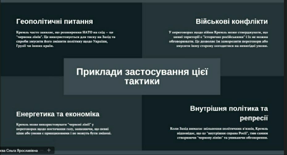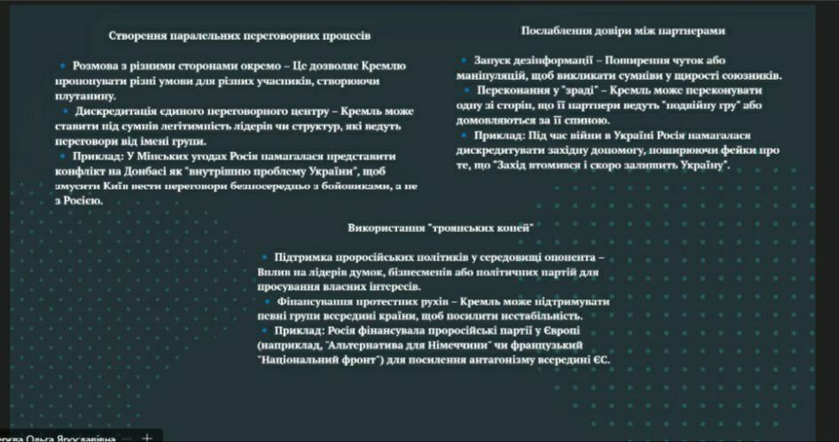 Ольга ПЕШТЄРЄВА розкрила формування принципів, стратегій та прийомів Кремлівської школи переговорів. До основних елементів цієї школи переговорів відноситься: висування завищених вимог, імітація непохитності, створення ілюзії обмеженого мандату, використання демонстрації сили, навмисне ігнорування компромісних пропозицій, готовність до зриву переговорів. Спікерка проаналізувала багато кейсів переговорів та звернула увагу на застосування, наприклад, тактики затягування переговорів: у період з 2014 р. Росія роками затягувала будь-які реальні переговори, імітуючи готовність до діалогу. Це давало їй час для військового зміцнення, пропагандистським діям з дестабілізації України. Один із ключових прийомів кремлівської школи переговорів — це формування альтернативної реальності, тобто створення власного наративу, який може суперечити фактам, але вигідний для сторони, яка веде переговори. Російські представники можуть прямо заперечувати очевидні факти, навіть коли докази вже наявні (наприклад, заперечення присутності російських військ у Криму в 2014 році, хоча вони вже були там без розпізнавальних знаків). Спікерка також розглянула маніпуляції під час мирних переговорів (лютий-березень 2022 року) : затягування часу та переговори як прикриття для воєнних дій. Сьогодні один із головних методів Кремля — розкол єдності Заходу через заклики до "миру за будь-яку ціну. Це створює політичний тиск на західні уряди та дає аргумент тим, хто виступає за зменшення підтримки Києва. У висновку спікерка пояснила, що «миротворчі ініціативи» Росії є пасткою для України: жодна з них не передбачає відновлення територіальної цілісності України.