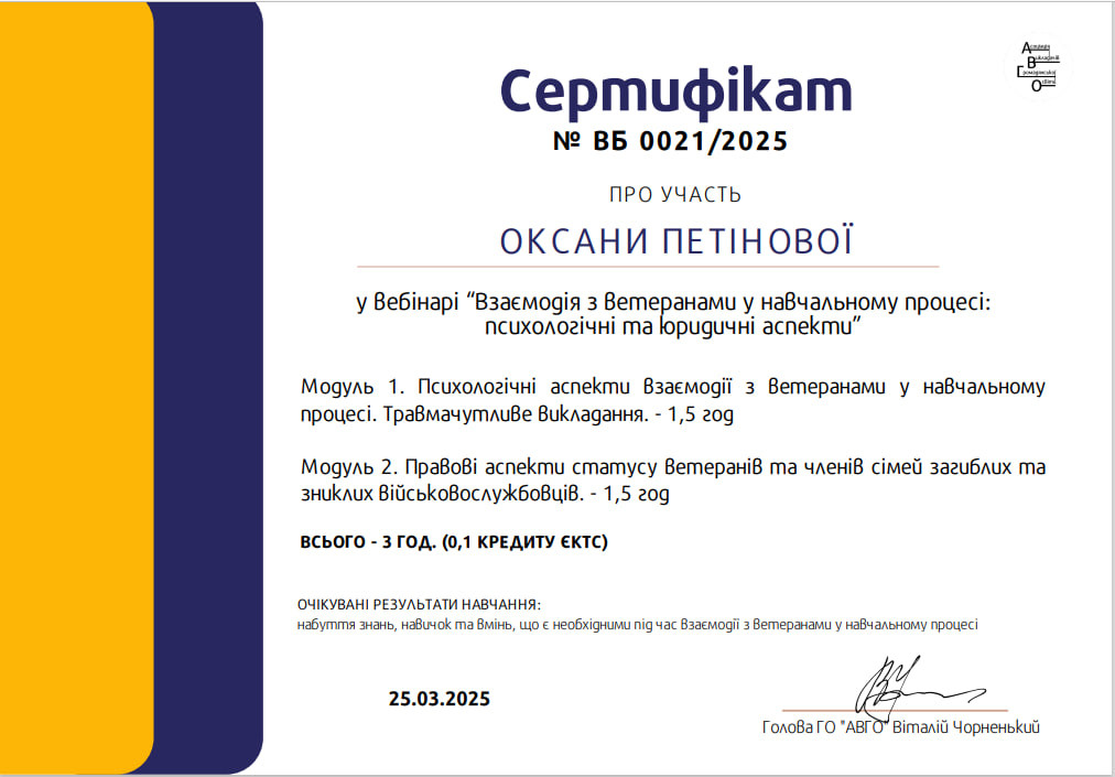 І етап академічної мобільності в межах міжнародного проєкту IFES за програмою «Democracy: from theory to practice» триває. Проф. Оксана Петінова та доц. Інна Проноза взяли участь у вебінарі «Взаємодія з ветеранами у навчальному процесі: психологічні та юридичні аспекти». Актуальність заходу полягає в необхідності формування інклюзивного, психологічно безпечного та правово обґрунтованого освітнього середовища для ветеранів, які повертаються до навчання. Опрацьовано модулі «Психологічні аспекти взаємодії з ветеранами у навчальному процесі. Травмачутливе викладання» та «Правові аспекти статусу ветеранів та членів сімей загиблих і зниклих військовослужбовців». Отримані знання сприятимуть створенню інклюзивного освітнього простору, чутливого до потреб студентів із досвідом військової служби. Інклюзія у вищій освіті — це конкретна практика реалізації демократичних цінностей, де кожен має право на освіту без дискримінації. Вебінар піднімає питання адаптації освітнього середовища для ветеранів, що є прикладом практичного втілення демократичного ідеалу – освіти для всіх.