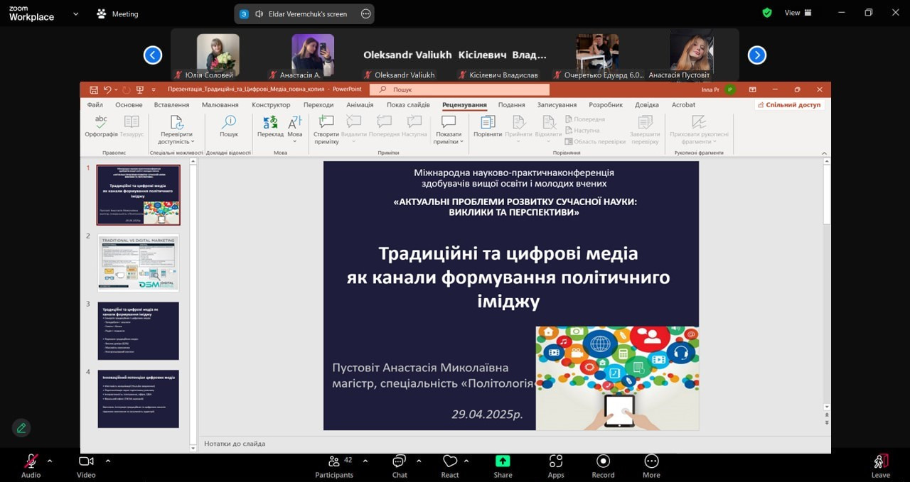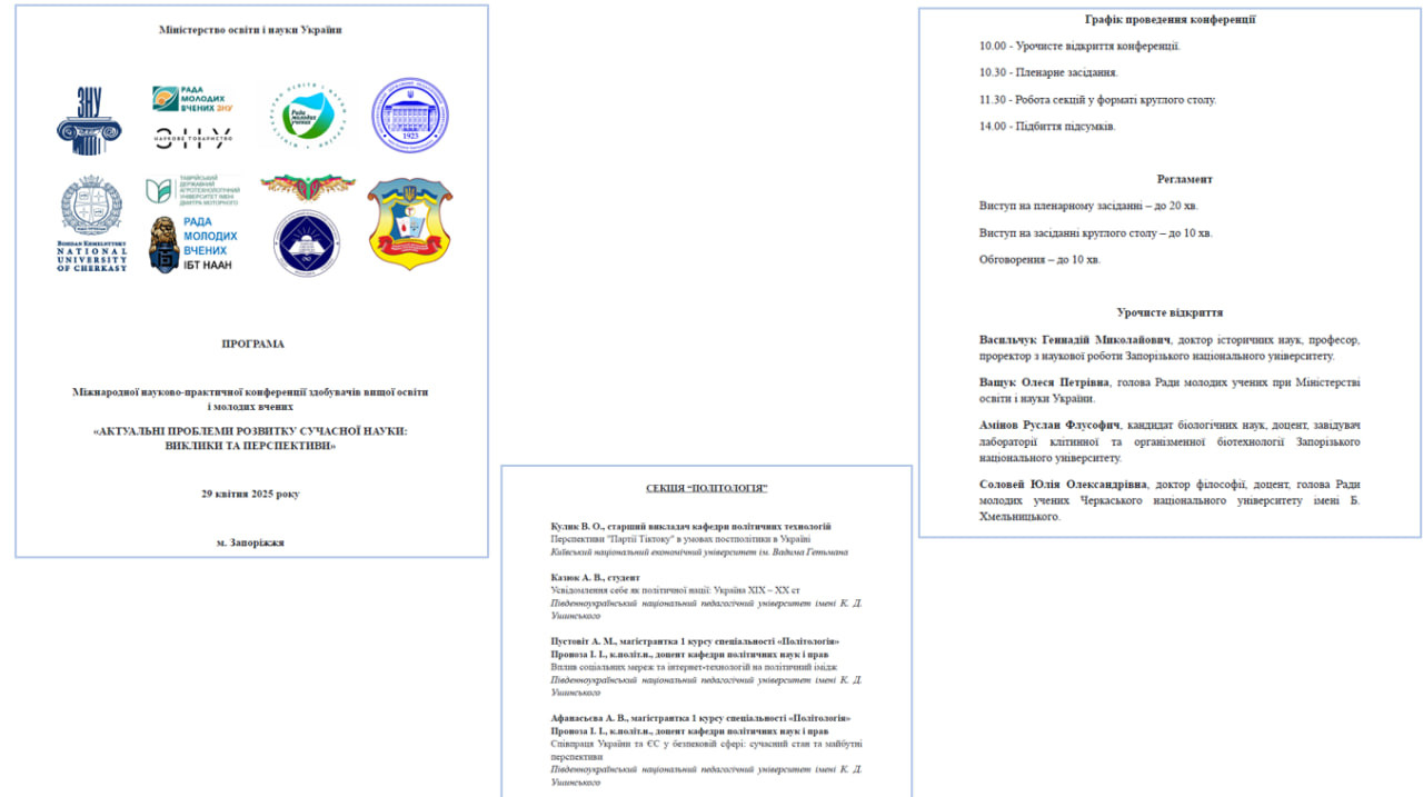 29 квітня 2025 року здобувачі бакалаврату та магістратури спеціальності «Політологія» Південноукраїнського національного педагогічного університету імені К. Д. Ушинського взяли активну участь у Міжнародній науково-практичній конференції здобувачів вищої освіти і молодих учених «Актуальні проблеми розвитку сучасної науки: виклики та перспективи», що відбулася на базі ЗВО-парнера Запорізького національного університету.