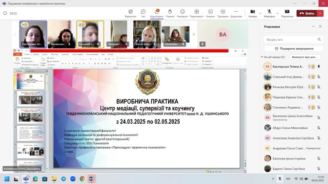 9 травня 2025 року на кафедрі загальної та диференціальної психології пройшла звітна конференція з виробничої практики здобувачів другого (магістерського) рівня вищої освіти першого року навчання за освітньо-професійною програмою «Прикладна і практична психологія» зі спеціальності 053 Психологія заочної форми навчання.