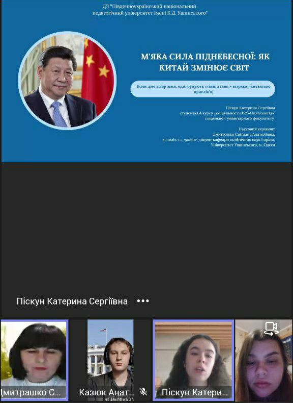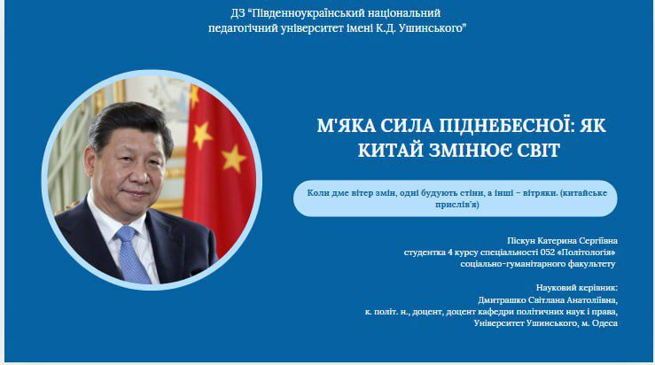 Було розглянуто важливі напрями м’якої сили Китаю: освітня дипломатія як частина стратегії м'якої сили, спрямована на зміцнення міжнародного впливу та покращення іміджу Китаю на глобальній арені; Китайська Народна Республіка активно використовує економічні ініціативи як інструмент м’якої сили для посилення свого впливу у світі. Ключовим проєктом у цій стратегії є ініціатива «Один пояс, один шлях» (BRI), започаткована у 2013 році; у межах загальної стратегії м’якої сили, поряд з економічними й освітніми ініціативами, Китай активно просуває власні цифрові технології. Китайські технологічні гіганти, зокрема Huawei, ByteDance (власник TikTok) та Alibaba, відіграють ключову роль у цьому процесі; у межах багаторівневої стратегії м’якої сили Китай не обмежується лише економікою, освітою чи технологіями — він також активно використовує символіку та емоційний вплив для зміцнення міжнародних зв’язків. Одним із яскравих прикладів є так звана «дипломатія панд», яка поєднує елементи культурного обміну, екології та політики. Китай вибудував комплексну й стратегічно злагоджену систему м’якої сили, яка поєднує інституційну підтримку, цифрову експансію, освітню співпрацю та інформаційний вплив. Це дозволяє йому ефективно зміцнювати свої позиції на міжнародній арені не лише через економічну чи військову міць, а й через позитивне сприйняття в очах світової спільноти. Зокрема, освітньо-культурний центр "Інститут Конфуція" Південноукраїнського національного педагогічного університету імені К.Д. Ушинського був заснований у 2012 році в партнерстві з Харбінським інженерним університетом (КНР). Він пропонує студентам професійне навчання китайської мови та є частиною мережі Інститутів Конфуція в Україні, які були відкриті на базі кількох університетів і активно функціонують у різних містах. Вони пропонують курси китайської мови для всіх охочих, організовують культурні заходи, виставки, кінопокази, лекції та семінари, що допомагають українцям краще розуміти Китай, його традиції та сучасні тенденції.
