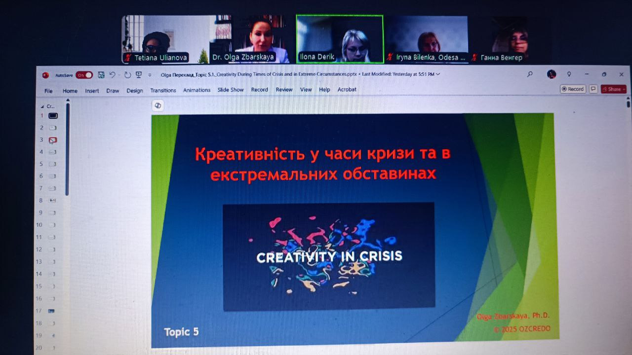 Викладачі кафедри загальної та диференціальної психології, аспіранти, здобувачі другого (магістерського) рівня вищої освіти зі спеціальності 053 Психологія ОПП «Прикладна і практична психологія» Університету Ушинського взяли участь у заході «Креативність у кризових та екстремальних ситуаціях», що був організований Інститутом креативного мислення «ОЗ КРЕДО»,(США); Південноукраїнським центром професійного розвитку керівників та фахівців соціономічної сфери Університету Ушинського.
