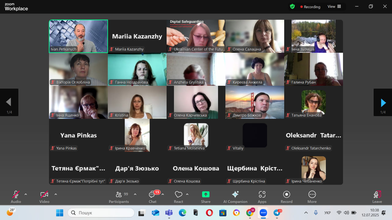 12 липня 2025 року здобувачі першого (бакалаврського) рівня вищої освіти за спеціальністю С4 Психологія Ірина ЧЕБАНЕНКО, Крістіна ЩЕРБИНА, Дар’я ЗЮЗЬКО та інші здобувачі долучилися до онлайн-інтенсиву «Digital Safeguarding: як допомогти молоді залишатися вільними у світі маніпуляцій»
