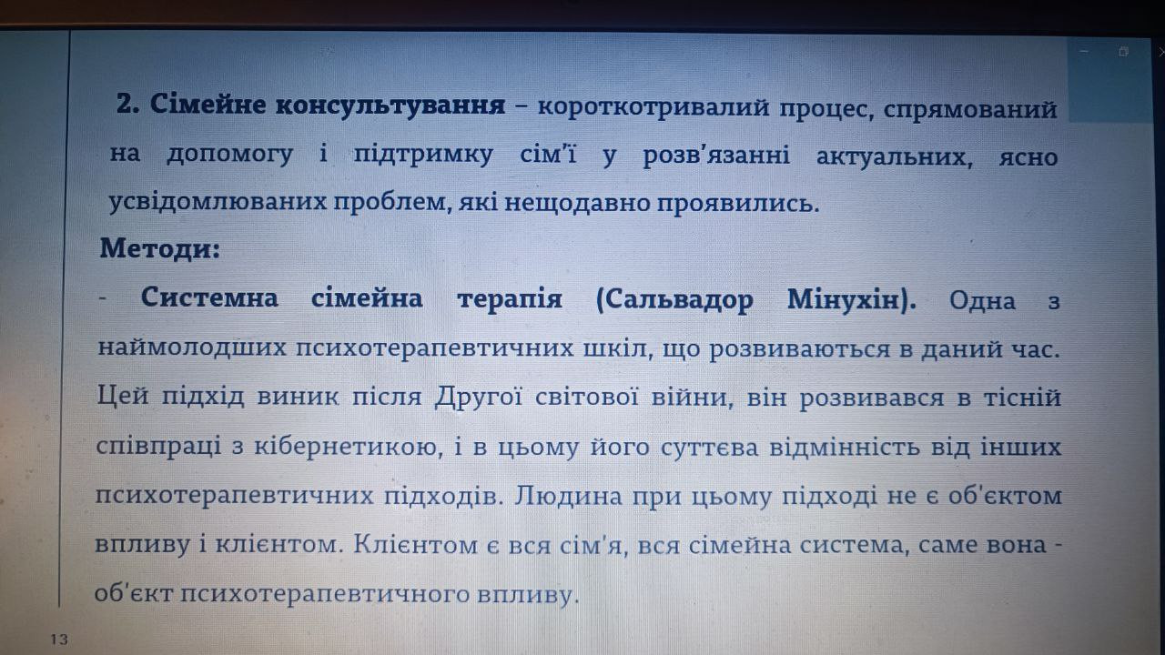 Під час майстер-класу учасники ознайомилися з сучасними психотерапевтичними техніками, які активно застосовуються в країнах ЄС, зокрема: когнітивно-поведінковою терапією, системною сімейною терапією, позитивною психотерапією, методами арт-терапії, травматерапії та іншими сучасними підходами.