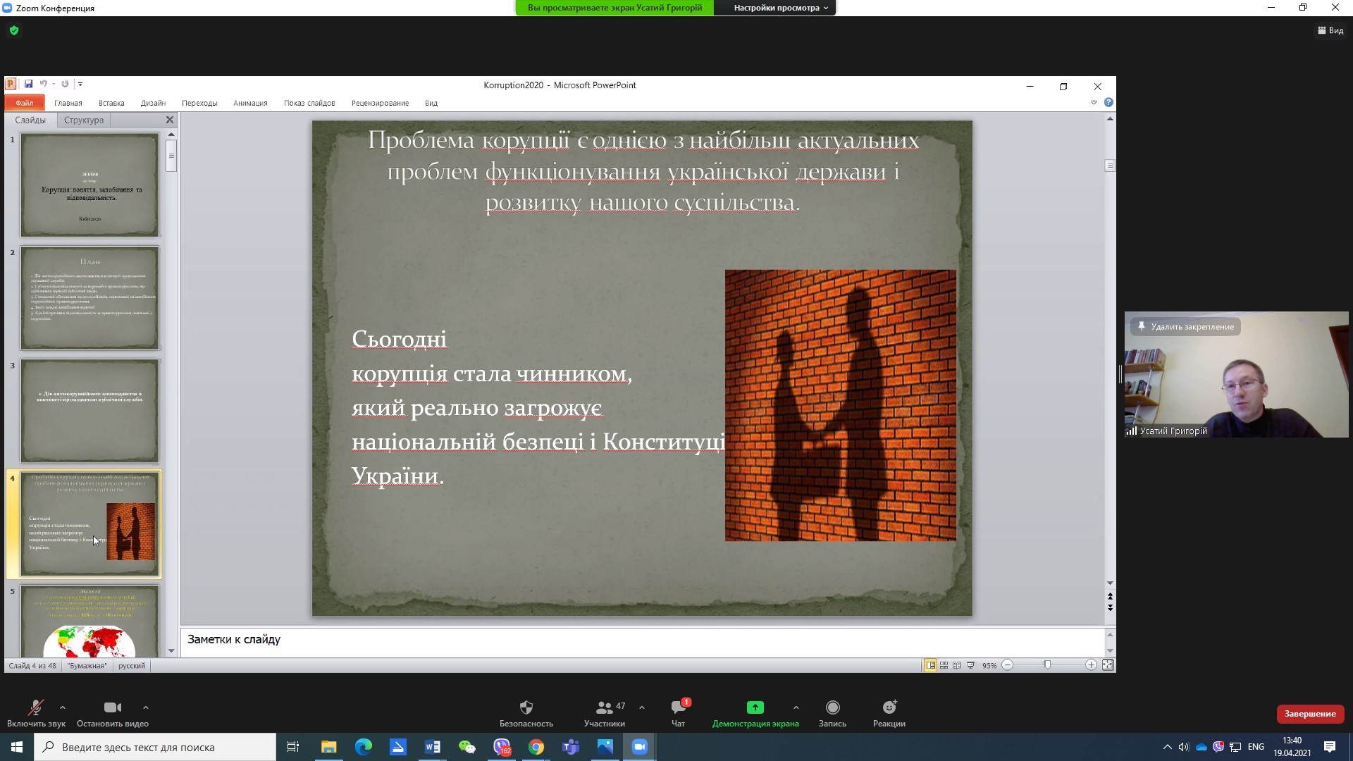 19 квітня 2021 року для студентів спеціальностей 052 Політологія та 081 Право в межах вивчення дисципліни «Запобігання та протидія корупції» відбулася гостьова лекція кандидата юридичних наук, доцента кафедри кримінально-правової політики та кримінального права Інституту права КНУ імені Т. Шевченка УСАТОГО Григорія Олександровича за темою «Антикорупційна стратегія України: сучасні виклики, новели законодавства та тенденції розвитку».