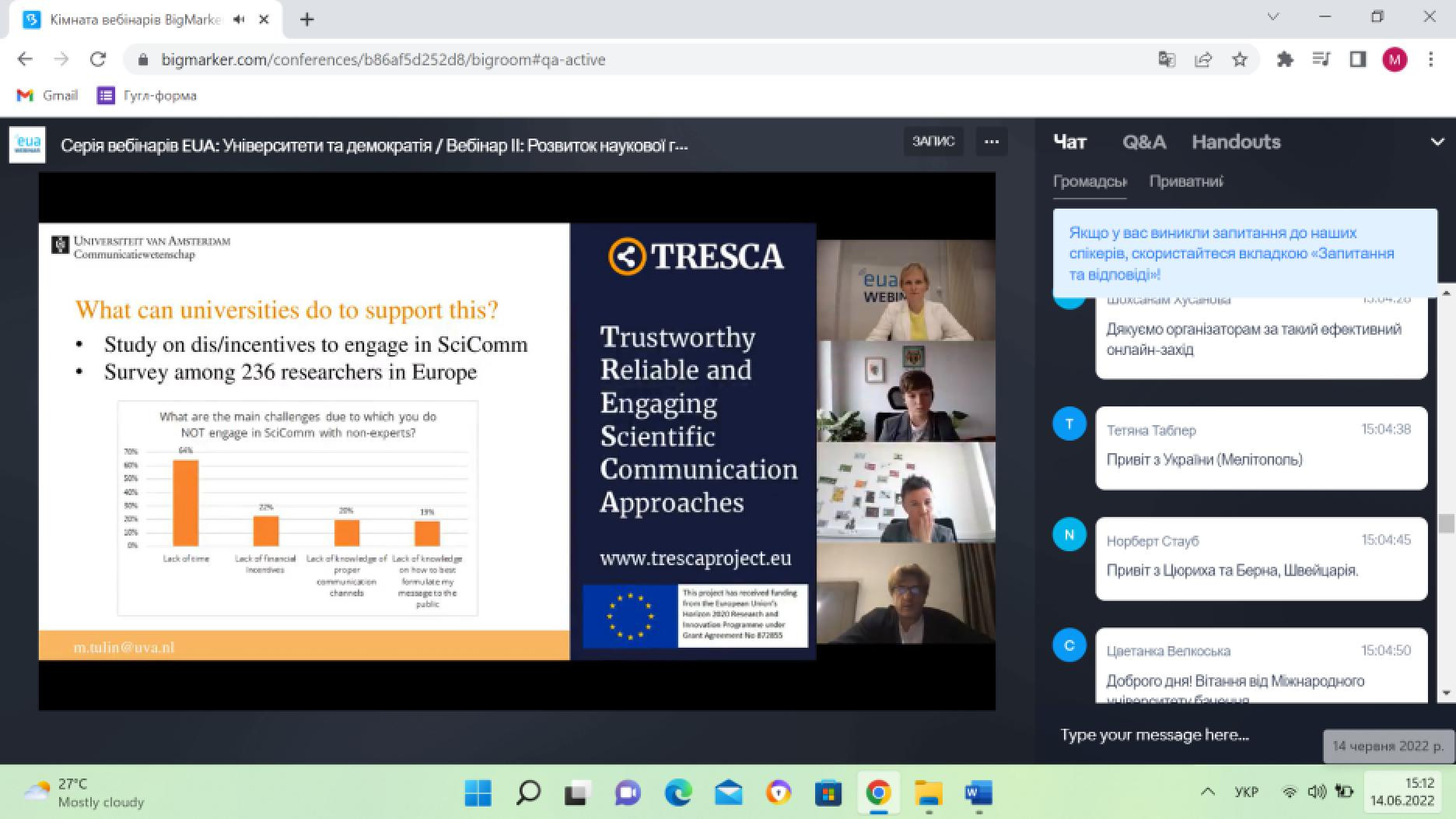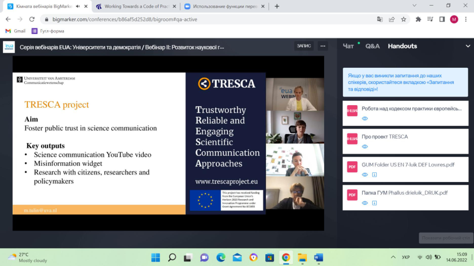 14 червня 2022 р. викладачі та здобувачі ОНП Психологія відвідали вебінар, організований Європейською асоціацією університетів «Підвищення наукової грамотності – майбутнє наукової комунікації».