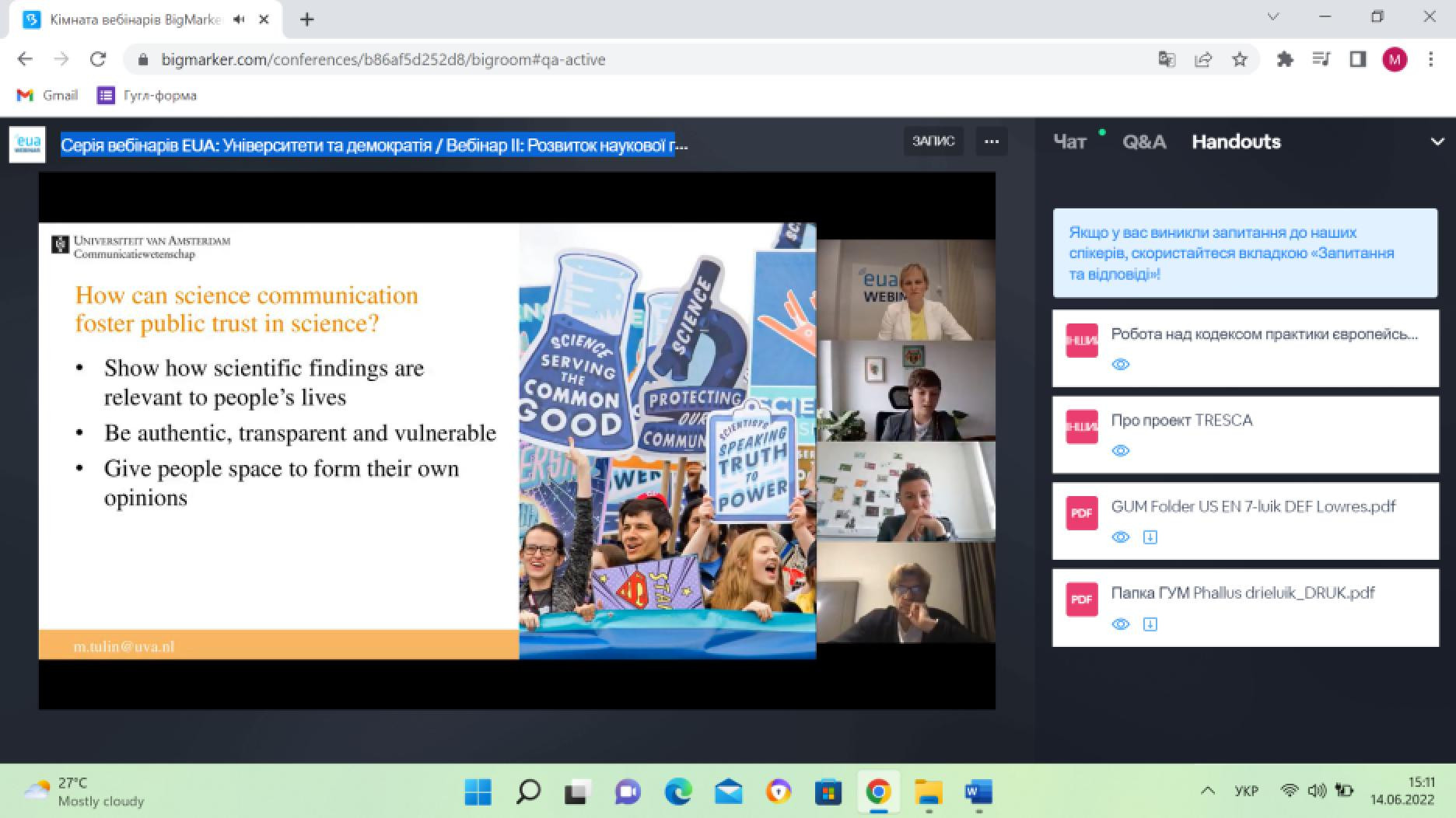 Спікери онлайн-заходу Мар'ян Дум (Директор Музею Гентського університету, Бельгія), Марина Тулін (Постдокторант Амстердамської школи комунікаційних досліджень, Амстердамський університет, Нідерланди), Фабріс Руссело (Головний редактор The Conversation France, Франція), Анна-Лена Клайс-Кулик (Заступник директора з координації політики та форсайту EUA), Девід Бадц Педерсен (Професор кафедри комунікацій та психології Ольборзького університету, Данія) у власних доповідях показали складнощі взаємодії у сучасному світі між пересічними громадянами, різними представниками громадськості, представниками ЗМІ та науки, а також важливість налагодження наукової комунікації задля забезпечення відсутності антагоністичного реагування громадськості на наукову практику.