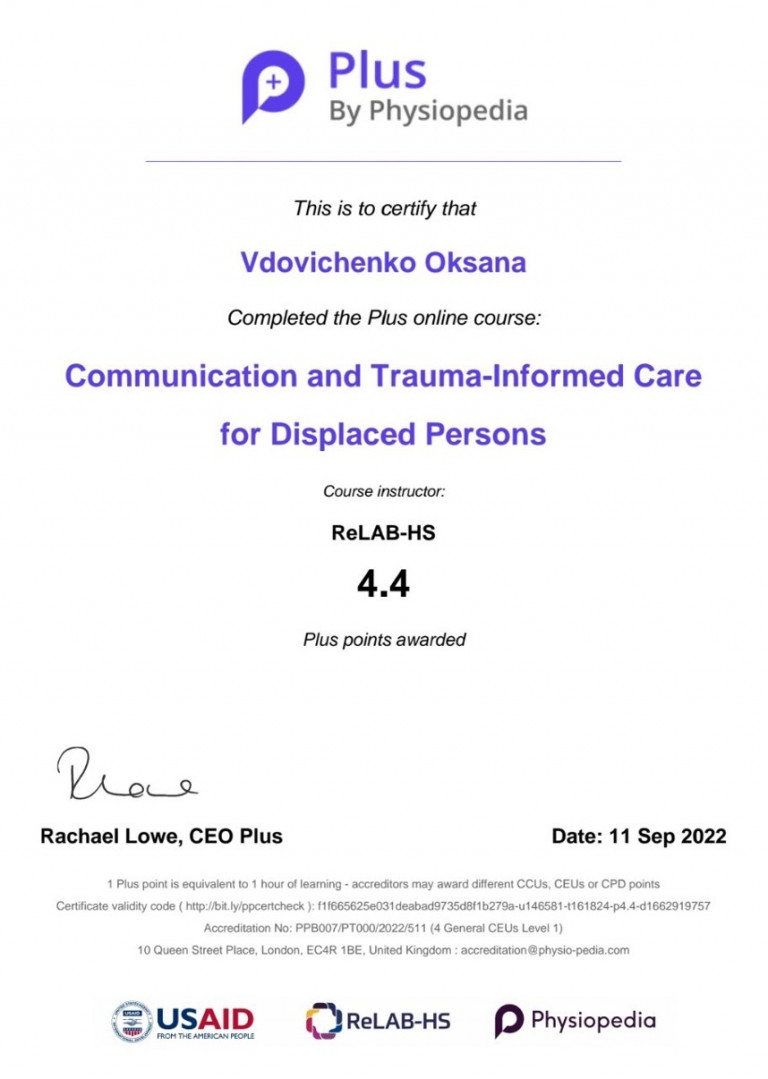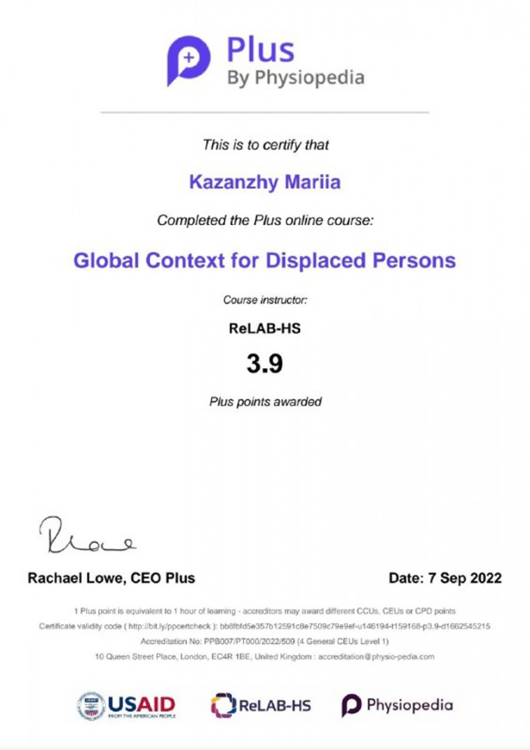 Члени робочої групи ОНП Психологія проф. Казанжи М.Й. та проф. Вдовіченко О.В. долучилися до програми «Розуміння реабілітаційних потреб переміщених осіб».Ця програма спрямована на озброєння фахівців всебічними знаннями про реабілітацію переміщених осіб. До 11 вересня 2022 року було пройдено три модулі програми, що дає змогу зрозуміти як задовольнити потреби біженців та переміщених осіб на кожному етапі міграційного процесу. Отримано знання щодо специфіки комунікації в реабілітаційному процесі, створення терапевтичного альянсу, довірливого терапевтичного простору, допомоги переміщеним особам з урахуванням травми; підходи, які зменшують вплив травми та вирішують труднощі людини, що пов’язані з травмою та психосоціальними проблемами тощо.