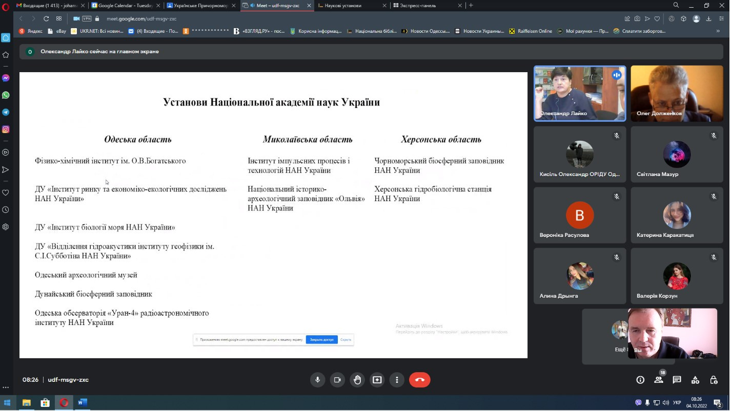 Темами обговорення стали освітньо-науковий, культурний, рекреаційно-лікувальний комплекси Українського Причорномор’я. До спілкування були залучені спеціалісти галузей: Лайко О.І, доктор економічних наук, професор, академік Академії економічних наук України, заступник директора з наукової роботи Інституту проблем ринку та економіко-екологічних досліджень НАН України; Гейко Л.М., кандидат економічних наук, доцент, наукова співробітниця відділу інтеграції науки, освіти і бізнесу Інституту ринку і економіко-екологічних досліджень НАН України, учений секретар Південного наукового центру НАН України і МОН України; Безверхнюк Т.М., доктор наук з державного управління, професор, заступник директора з наукової роботи Українського науково-дослідного інституту медичної реабілітації та курортології МОЗ України.