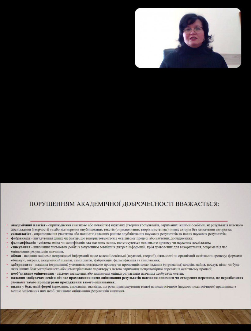 Було обговорено питання дотримання принципів академічної доброчесності – що вважається порушення академічної доброчесності, до якої відповідальності притягуються порушники академічної доброчесності; відповідні правові підстави та наявні нормативні акти, особливості академічного плагіату та що вважається недобросовісним використанням власної освітньої, наукової, творчої діяльності тощо.